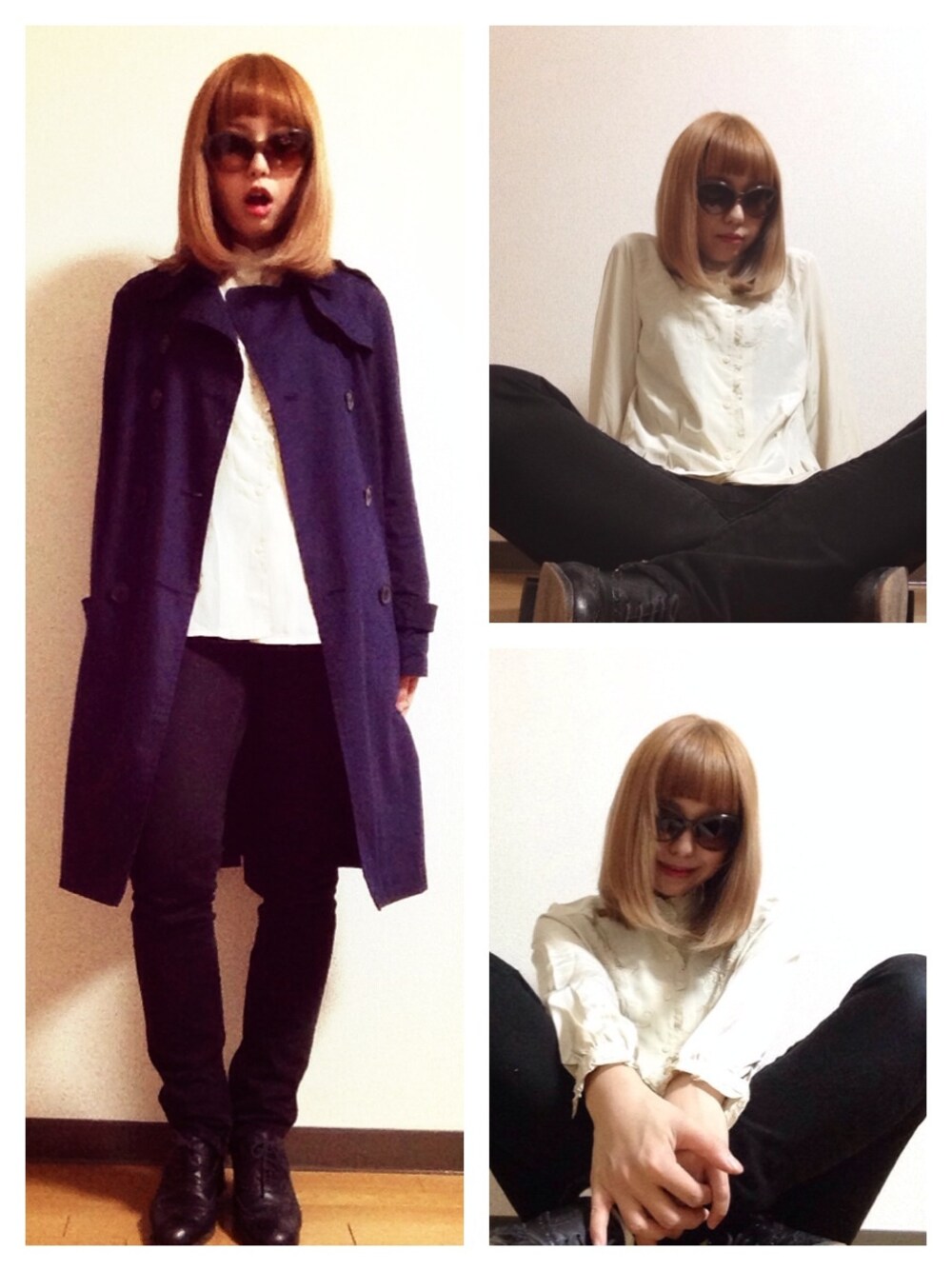 トップス/vintage パンツ/superfine コート/KBF シューズ/made in italy サングラス/coach こないだ見つけた ヴィンテージのフリルシャツが 可愛すぎるけど 髪切ったり染めたりしたら 多重人格探偵サイコの全一 みたいになってしまったよ。 胡散臭いよ。