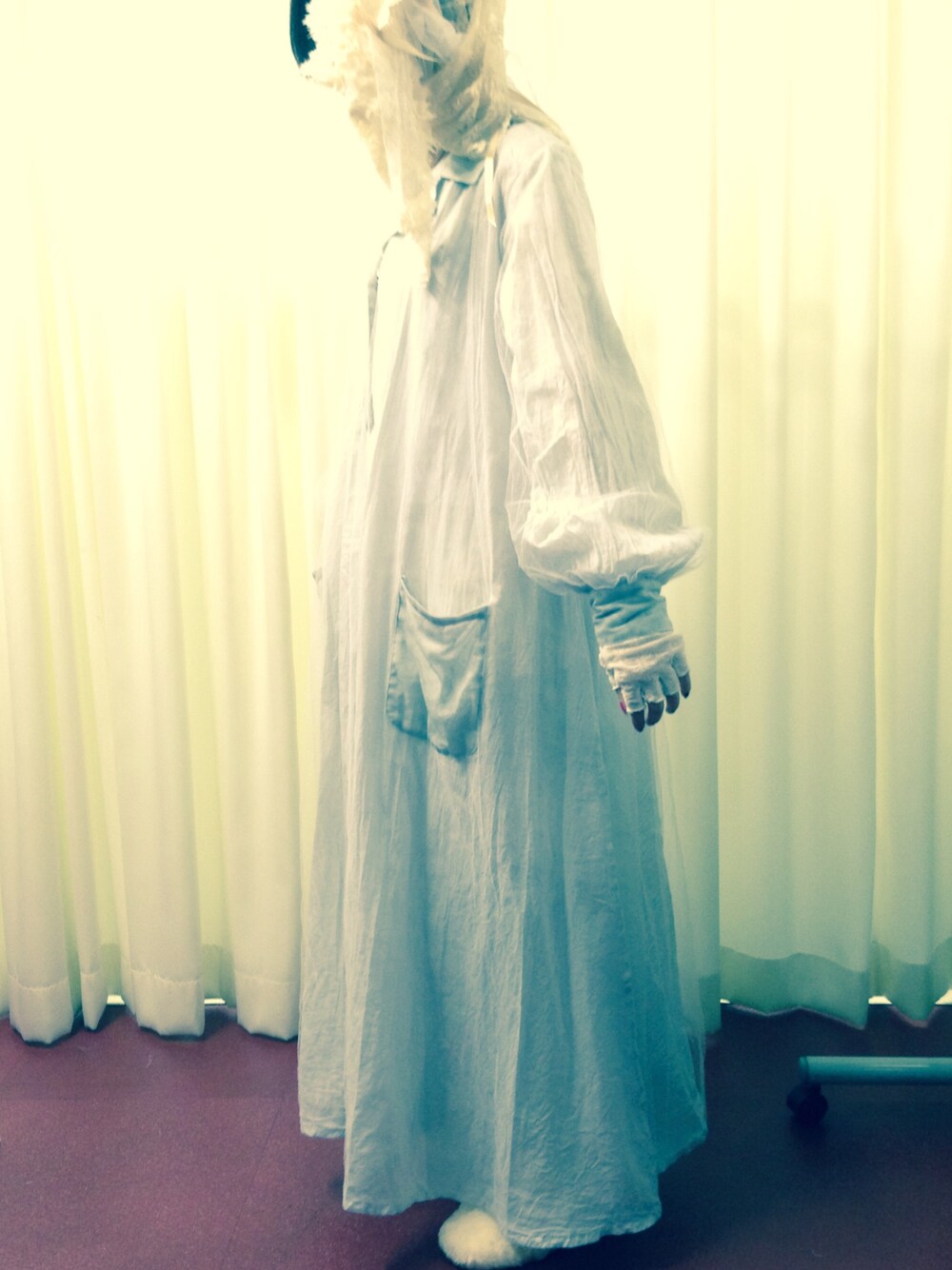 2014年VAMPSハロウィンパーティーに出演したTommy heavenly6の為に製作されたドレス。 表には薄いベールのように全てをソフトチュールで包み重ねた二重仕立てのシルキーパジャマドレス。 アリスの世界の少女が着るパジャマみたいなイメージのオーバーラインが新鮮なアイテム。 ライブ当日にTommy heavenly6の意向によりダメージ加工と汚し加工が追加。 特殊メイク担当の岩倉君のエアーブラシで汚れ加工、血糊のペイント加工が加わり本場ギリギリ見事に完成したドレス。