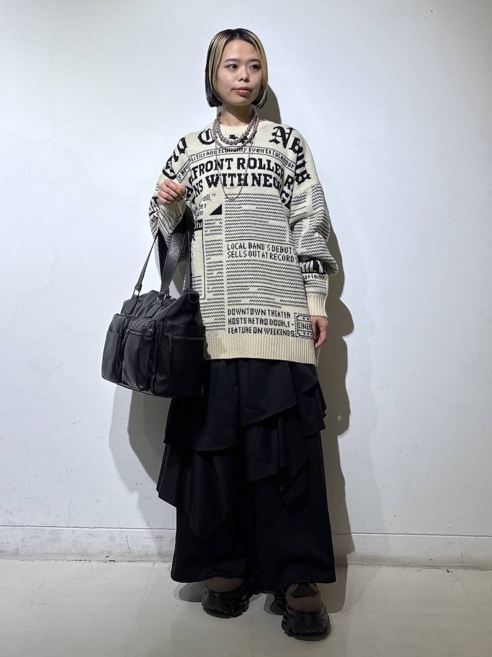 ラフコーデ📰🖤 💡各アイテムのおすすめポイント  ̄ ̄ ̄ ̄ ̄ ̄ ̄ ̄ ̄ ̄ ̄ ̄ ̄ ̄ ̄ ̄ ̄ 【トップス】 ニュースペーパーをモチーフにした総柄ニット! 身幅はかなりゆったりしてます。 ルーズ感がこなれた印象に見せてくれます🫶 アクリルニット生地を使用なのでチクチクせずに、とても軽いです✨ 【ボトムス】 スカートでは珍しく嬉しいベルトループ付き! ランダムなアシンメトリーデザインが人目引きオシャレ顔間違いなしです💃 ベルトループ付きなので身長、体型問わずにお使い頂けそうです💫