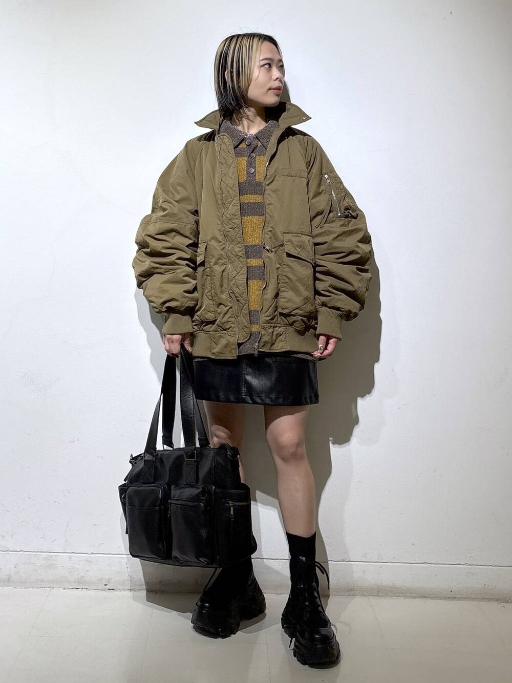 カジュアルコーデ🐝🖤 💡各アイテムのおすすめポイント  ̄ ̄ ̄ ̄ ̄ ̄ ̄ ̄ ̄ ̄ ̄ ̄ ̄ ̄ ̄ ̄ ̄ 【アウター】 袖にたっぷりギャザーが入ったミリタリーブルゾン! 襟を立ててスタンドネック仕様にもできるので首元まであったかいです🍵155cmMサイズ着用してます! 【トップス】 まるでベロアのようなもちふわとした質感を持つモールライクなポロニット! ポリエステル100%なので毛玉になりにくい🧶 程よくゆとりがあるので女性はルーズにゆるっと着用頂けます☺️ 【ボトムス】 合成皮革なのでめちゃめちゃ高見えします❣️ 後ろのみゴムなのでストレッチ性抜群✨️