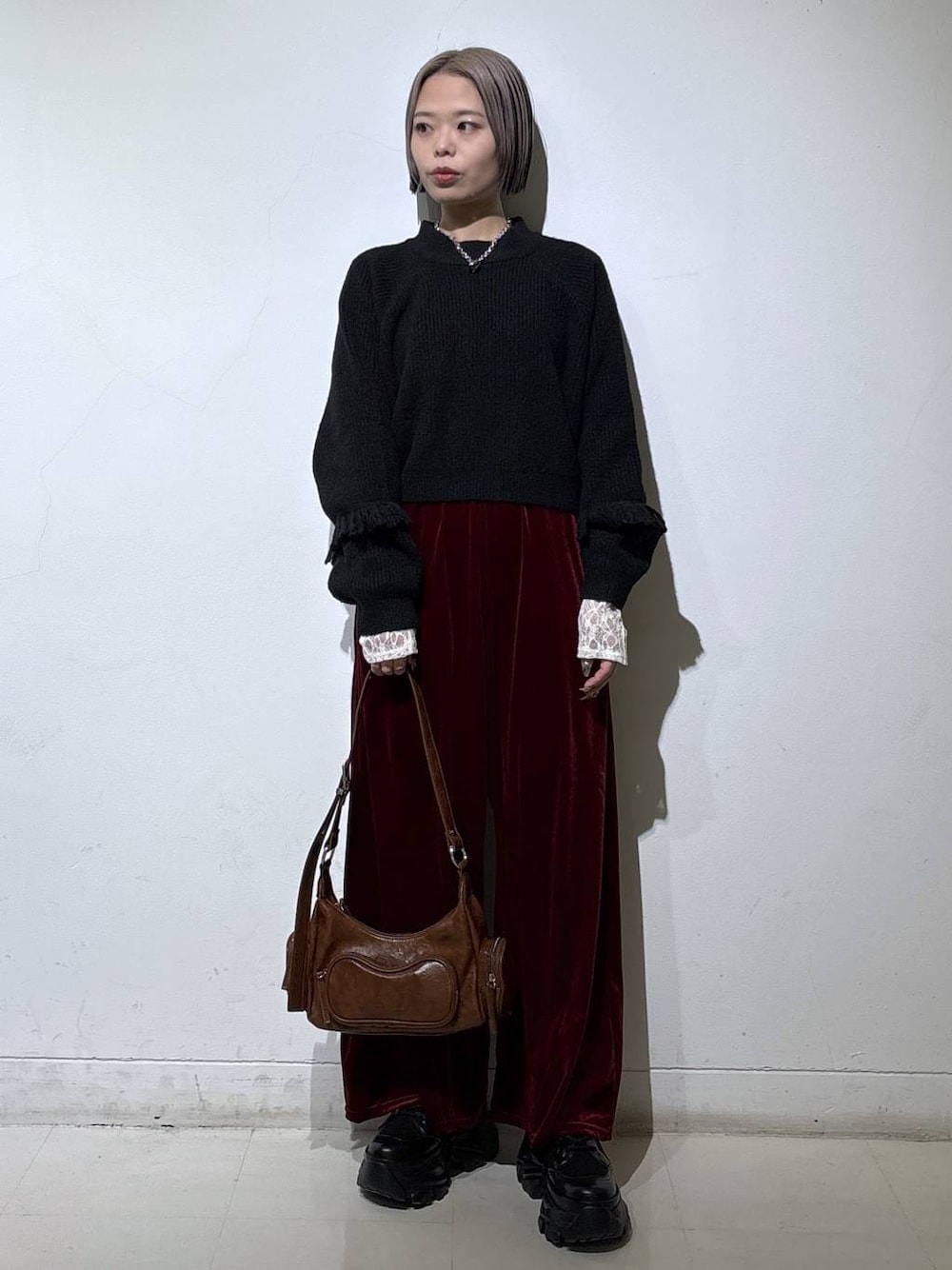 モードカジュアルコーデ🍓🖤 💡各アイテムのおすすめポイント  ̄ ̄ ̄ ̄ ̄ ̄ ̄ ̄ ̄ ̄ ̄ ̄ ̄ ̄ ̄ ̄ ̄ 【トップス】 シンプルだからこそ絶対使えるニット! フリンジのデザインがアクセントになって🙆♀️ 首元も詰まりすぎず生地ももっちりしているので1枚でも着やすいです💓 【ボトムス】 人気のスウェットパンツと同じシルエットのベロアワイドパンツ!ポケットは前側のみです。 2サイズ展開に加えてベルトループつきは有難い😭 シルエットも神がかってます💕