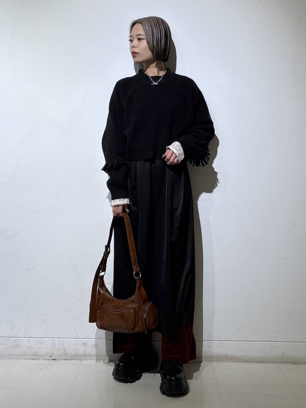 モードコーデ🍎🖤 💡各アイテムのおすすめポイント  ̄ ̄ ̄ ̄ ̄ ̄ ̄ ̄ ̄ ̄ ̄ ̄ ̄ ̄ ̄ ̄ ̄ 【トップス】 シンプルだからこそ絶対使えるニット! フリンジのデザインがアクセントになって🙆♀️ 首元も詰まりすぎず生地ももっちりしているので1枚でも着やすいです💓 【ボトムス】 人気のスウェットパンツと同じシルエットのベロアワイドパンツ!ポケットは前側のみです。 2サイズ展開に加えてベルトループつきは有難い😭 シルエットも神がかってます💕 【スカート】 トレンドのサテン生地スカート! 今時期は正直言って1枚で履くには寒いのでタイツ必須かデニム等のレイヤードで使えそうです◎ シルエットがスッキリしているので細見え効果抜群です✨