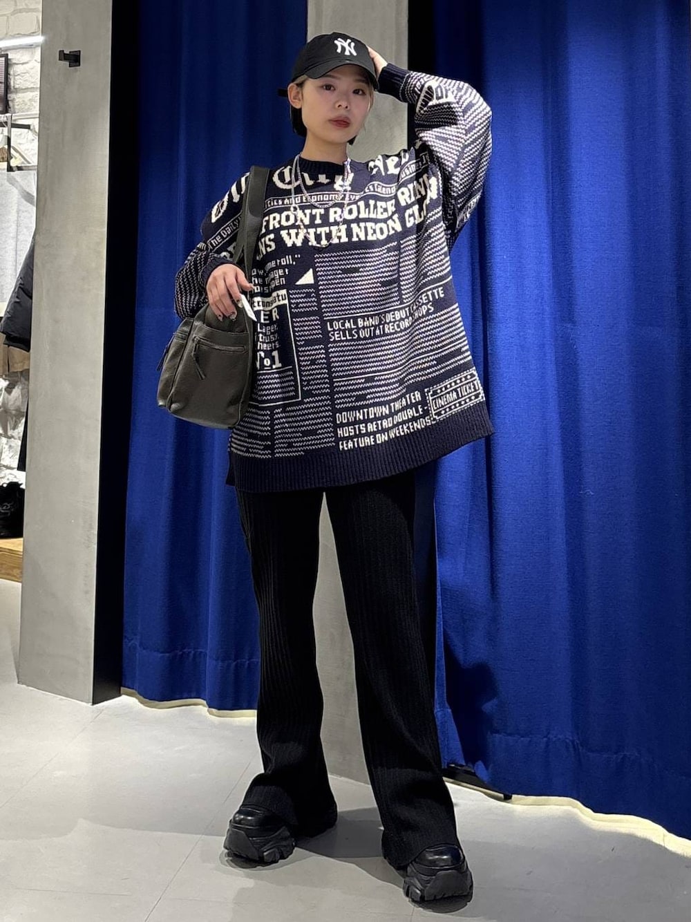 メンズライクコーデ🦕🤍 💡各アイテムのおすすめポイント  ̄ ̄ ̄ ̄ ̄ ̄ ̄ ̄ ̄ ̄ ̄ ̄ ̄ ̄ ̄ ̄ ̄ 【トップス】 ニュースペーパーをモチーフにした総柄ニット! 身幅はかなりゆったりしてます。 ルーズ感がこなれた印象に見せてくれます🫶 アクリルニット生地を使用なのでチクチクせずに、とても軽いです✨ 【ボトムス】 やわらかいニット生地のフレアパンツ! リブが細めなので程よくラインをひろい脚長効果抜群です🤩ウエストはベルトループつき◎ 個人的にはやや長めの丈感かなと感じました!