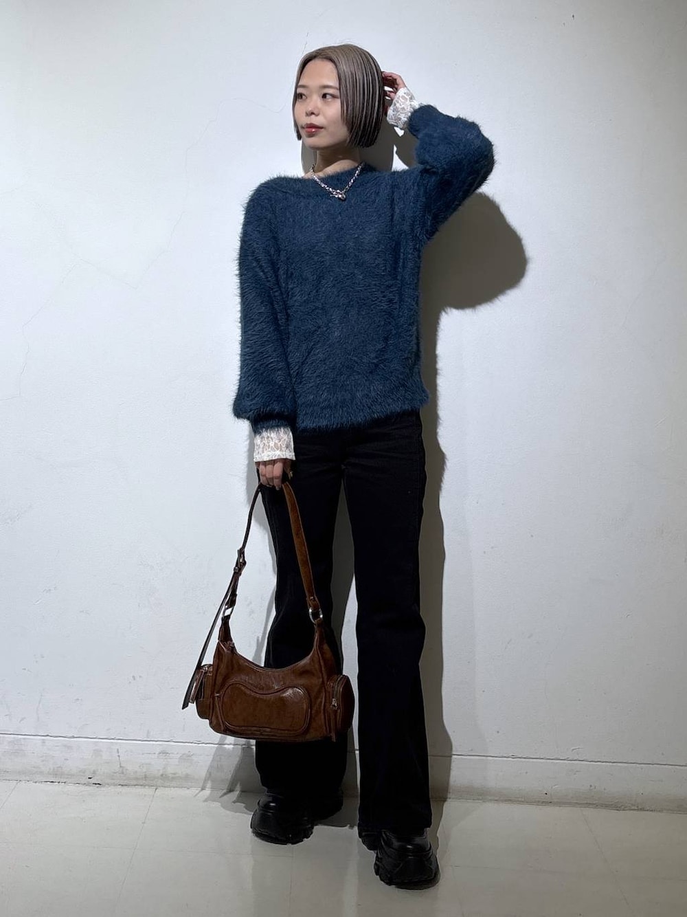 モードカジュアルコーデ❄️💙 💡各アイテムのおすすめポイント  ̄ ̄ ̄ ̄ ̄ ̄ ̄ ̄ ̄ ̄ ̄ ̄ ̄ ̄ ̄ ̄ ̄ 【トップス】 名前の通り着ているだけで眠くなるほどふっわふわでずっと着ていたくなる新感覚ニットです😴💓 長めのシャギーが綺麗めにもモードにもフェミニンにも決まります✨️オフショルやワンショルで肌見せでより着痩せ効果抜群です🥰 【ボトムス】 大大大人気のフレアデニム! 美シルエットなので履くだけで着痩せ効果抜群💫