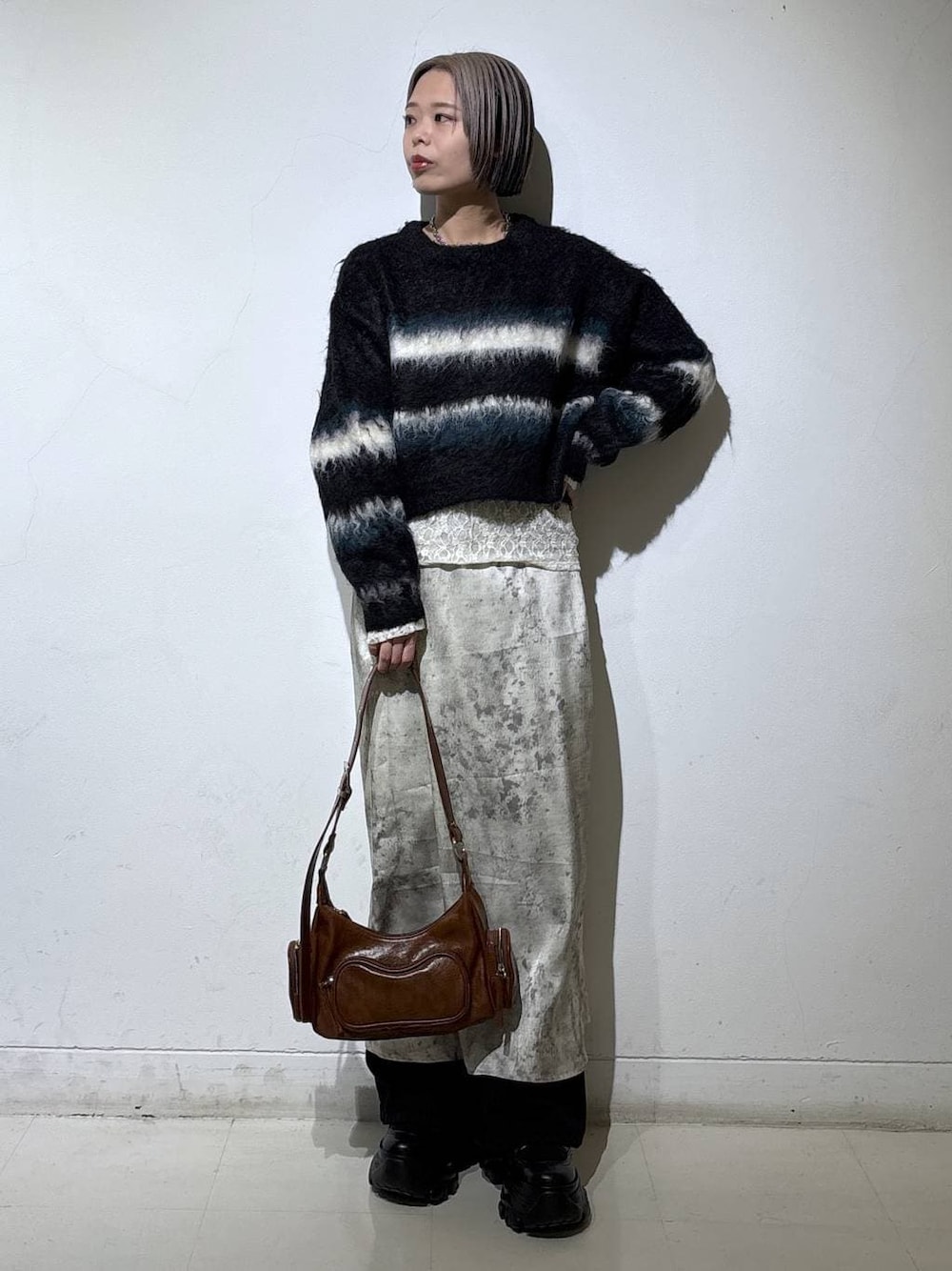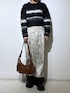 レイヤードコーデ🌈🖤 💡各アイテムのおすすめポイント  ̄ ̄ ̄ ̄ ̄ ̄ ̄ ̄ ̄ ̄ ̄ ̄ ̄ ̄ ̄ ̄ ̄ 【トップス】 大人気のボーダーニット! ボーダーは今季トレンドなので1枚持っておくとオシャレ顔間違いなしです✨程よくショート丈なのでボトムス選ばずにお使い頂けます◎ 【スカート】 トレンドのサテン生地スカート! 今時期は正直言って1枚で履くには寒いのでタイツ必須かデニム等のレイヤードで使えそうです◎ シルエットがスッキリしているので細見え効果抜群です✨ 【ボトムス】 人気のスウェットパンツと同じシルエットのベロアワイドパンツ!ポケットは前側のみです。 2サイズ展開に加えてベルトループつきは有難い😭 シルエットも神がかってます💕