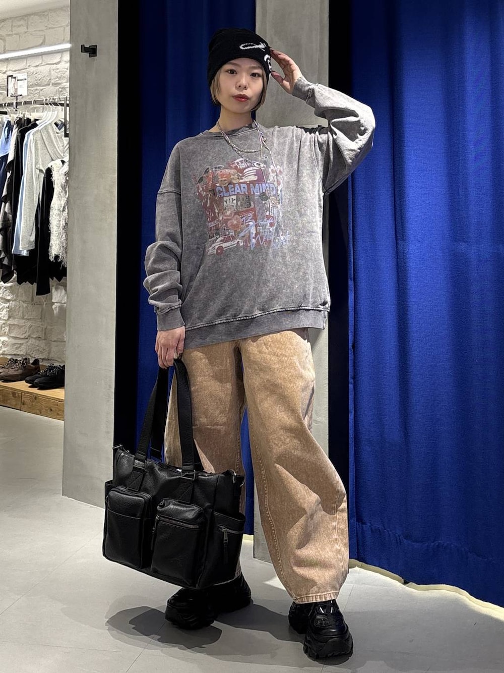 ストリートコーデ🍊🖤 💡各アイテムのおすすめポイント  ̄ ̄ ̄ ̄ ̄ ̄ ̄ ̄ ̄ ̄ ̄ ̄ ̄ ̄ ̄ ̄ ̄ 【トップス】 ニューヨークの街並みをモチーフにしたグラフィックスウェット!ヴィンテージライクな加工がPBLIMらしくてかわいいです♡155cmでMサイズ着用でおしり半分くらいの長さでオーバーサイズすぎずにボトムス選ばず着用頂けると思います😊 【ボトムス】 ルーズなバルーンシルエットのデニムパンツ! トレンド感のある膨らみあるデザインが可愛いです🫶 股上深めなのでハイウエストで履き込むことも出来ます☺️ 私と同じ155cm前後の方はSサイズがおすすめです🙆♀️