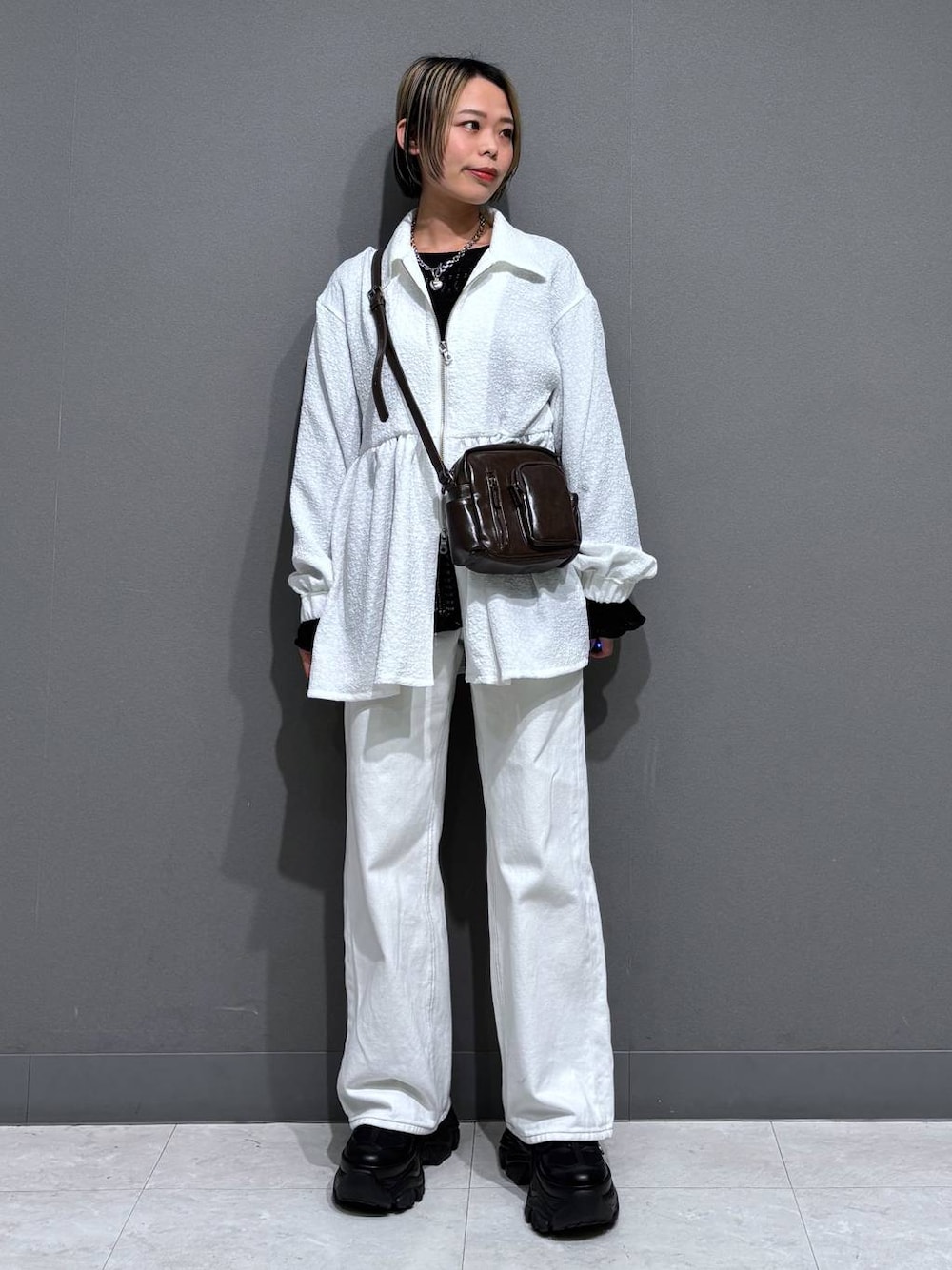 ホワイトコーデ🐻❄️🤍 💡各アイテムのおすすめポイント  ̄ ̄ ̄ ̄ ̄ ̄ ̄ ̄ ̄ ̄ ̄ ̄ ̄ ̄ ̄ ̄ ̄ 【アウター】 立体的なジャガード生地のペプラムブルゾン! 腰部分の切り替えが高く設定されているので足長く見えます👀WZIPも活用すればなおスタイルアップも叶います✨️腰周りのカバーにもってこいの丈感で生地もポリエステル多めなのでサラッとした着心地で軽い羽織りに最適です🌸 【インナー】 メロンの表面のような模様のカットソー🍈 浅いUネックと深いUネックの前後2WAYでお使い頂けます◎伸縮性もあり着心地抜群✨️ 暑いシーズンは1枚で、寒いシーズンはインナーとして手元からチラッと見せても華やかです💖 【ボトムス】 お久しぶりの定番ストレートデニム登場です✨️ とにかくシルエットが綺麗すぎて脚激盛れします😍 ヒップラインもひろわないので体型カバーも叶います💓 マイナス5キロ見えもこれ1本できまりますよ!!
