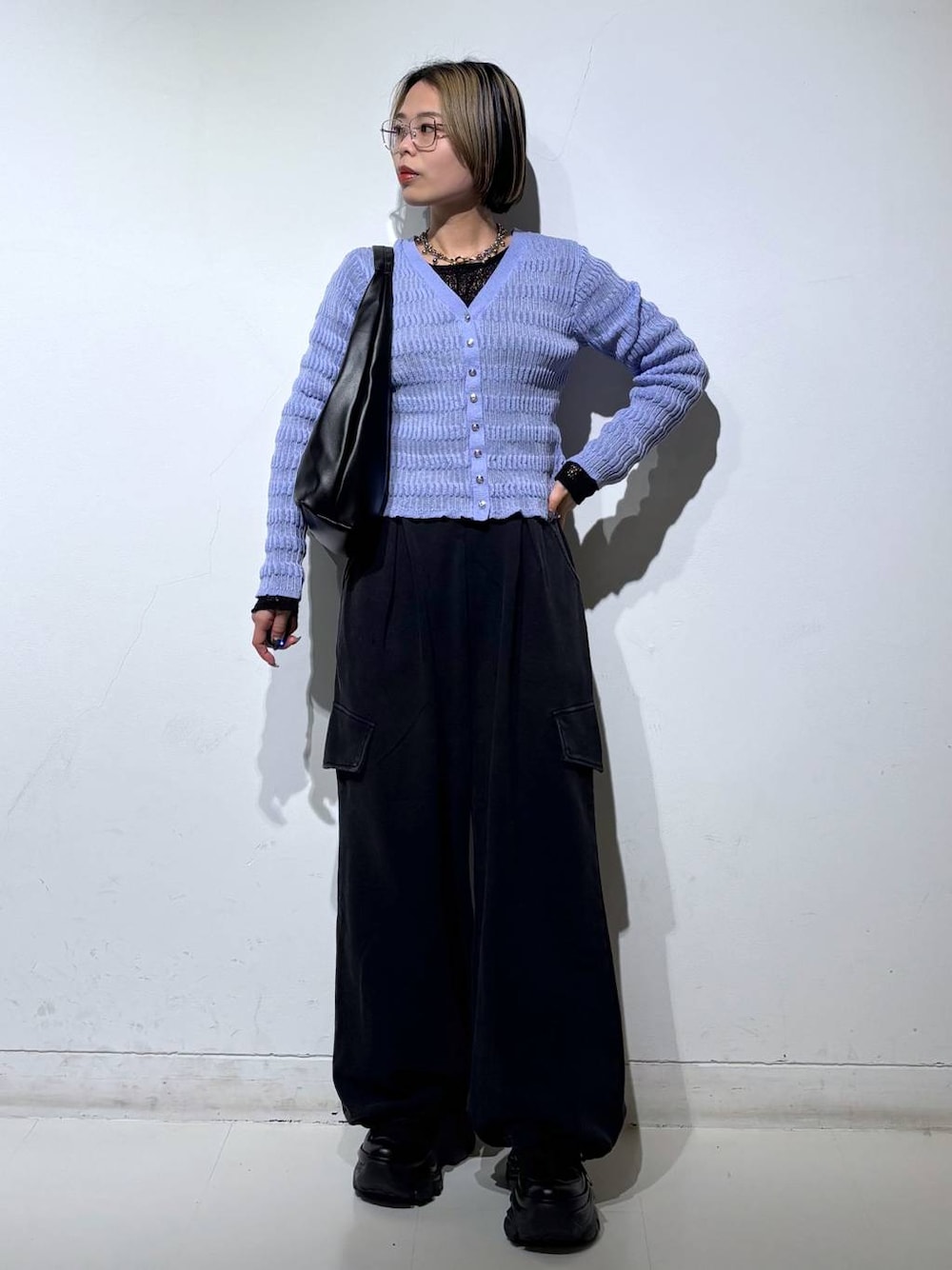 きれいめカジュアルコーデ🍇🖤 💡各アイテムのおすすめポイント  ̄ ̄ ̄ ̄ ̄ ̄ ̄ ̄ ̄ ̄ ̄ ̄ ̄ ̄ ̄ ̄ ̄ 【トップス】 今時期にちょうどいいシアー素材のカーディガン! 程よくラインをひろうのでスタイルアップ効果も🙆♀️ 前のボタンを開けて羽織としてもお使いいただけます! やや凹凸感のある立体的なデザインが細見えさせてくれます✨️チクチク感もなく着れました☺️ 【インナー】 メロンの表面のような模様のカットソー🍈 浅いUネックと深いUネックの前後2WAYでお使い頂けます◎伸縮性もあり着心地抜群✨️ 暑いシーズンは1枚で、寒いシーズンはインナーとして手元からチラッと見せても華やかです💖 【ボトムス】 スウェットなのにカーゴパンツデザインで人と被りにくいスウェットパンツ!PAGEBOYで人気なデザインボトムスが夏仕様となり登場✨️S、Mの2サイズ展開ですが、従来のボトムスよりSサイズは特に短めなので小柄さんも絶対大丈夫◎裾は絞りつきなのでそちらも活用出来るのは嬉しい!個人的に丈は5cm違い、ウエストは最大100cm伸びるのはどちらのサイズでも変わらないので身長優先で決めた方がいいなと思いました☺️155cmでMサイズ着用です。