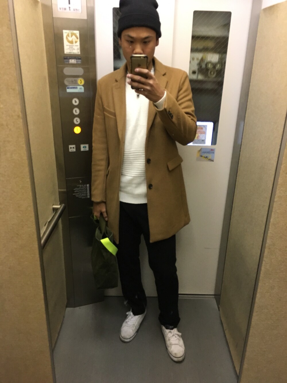 チェスターコートに合わせたコーディネート。 頭が坊主になってしまったのでニット帽でハゲ隠し。笑笑