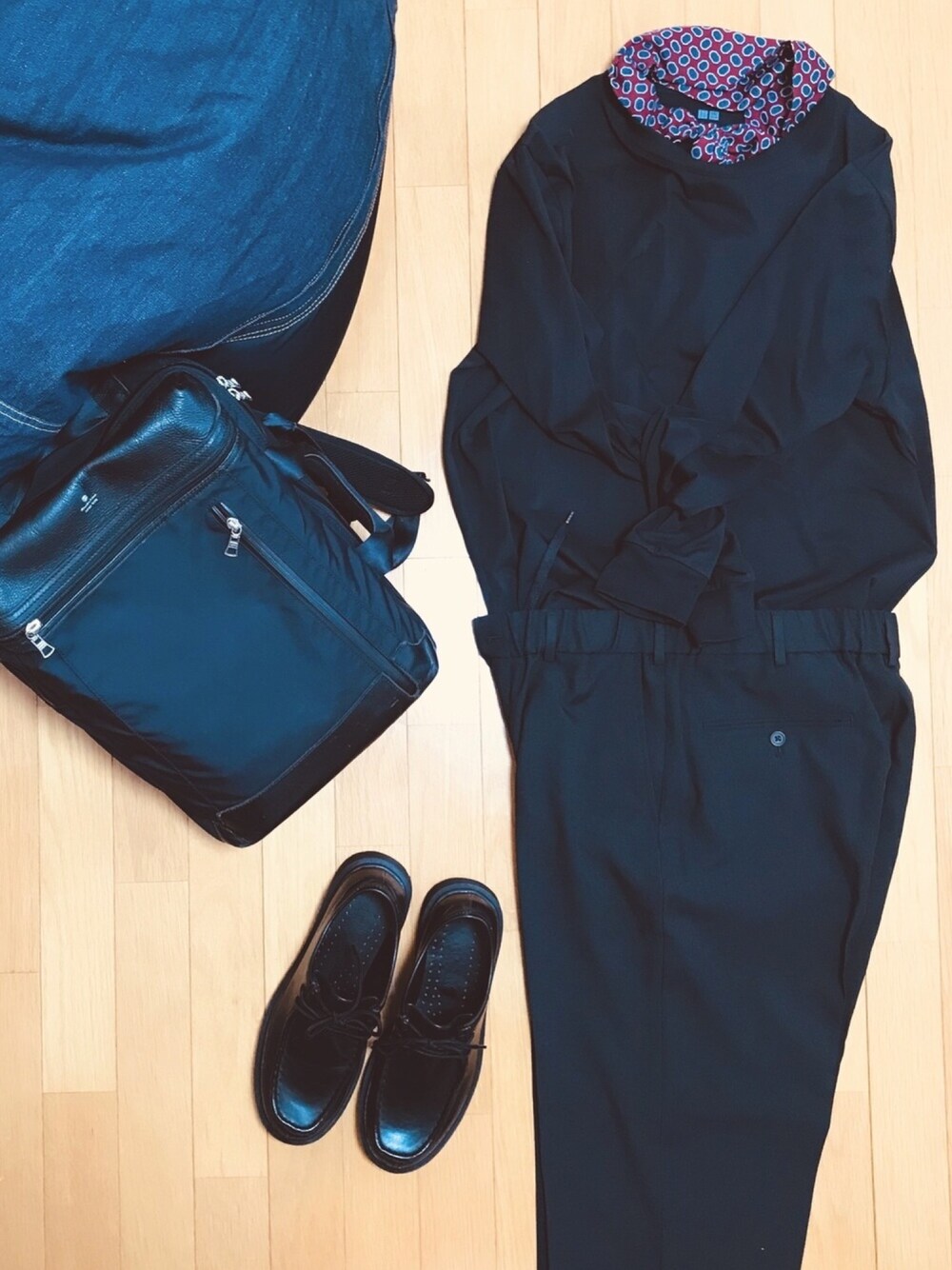 ストールは古着屋のもの UNIQLOのUVカットのTシャツとスラックス、 これねー、タックインして着ると良いです マスターピースのリュックも気に入ってる