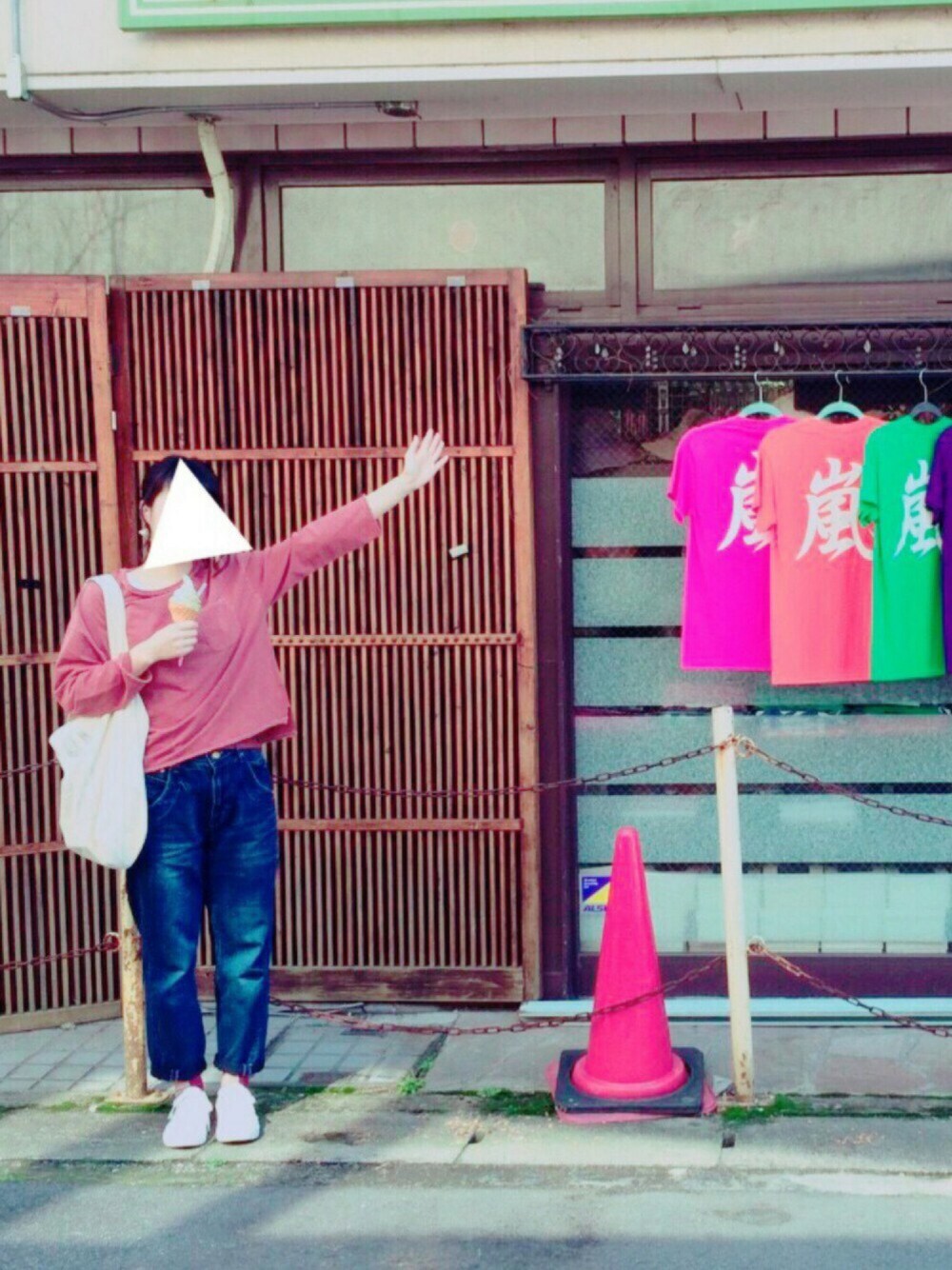 2016.3.17 京都旅行。 Where?--->嵐山のお土産屋さん前にて。 このTシャツ嵐のライブで使うやつかと思ったら 友達に「嵐山だからだよ!」て言われて あ、ここ嵐山だった、だからTシャツに嵐って書いてあるのか、、!と気づいた。 ※ボケではない。