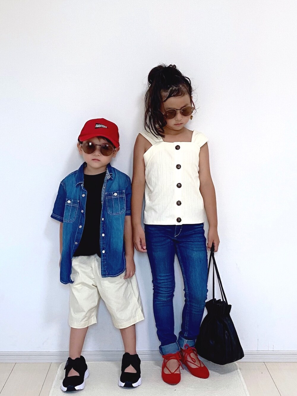 👧🏾のbreezeさんタンク色違いで買ったもぅ1色はホワイトに♡ 2人でデニム合わせの赤差しコーデ♬ 覗いて頂きありがとうございました☺︎