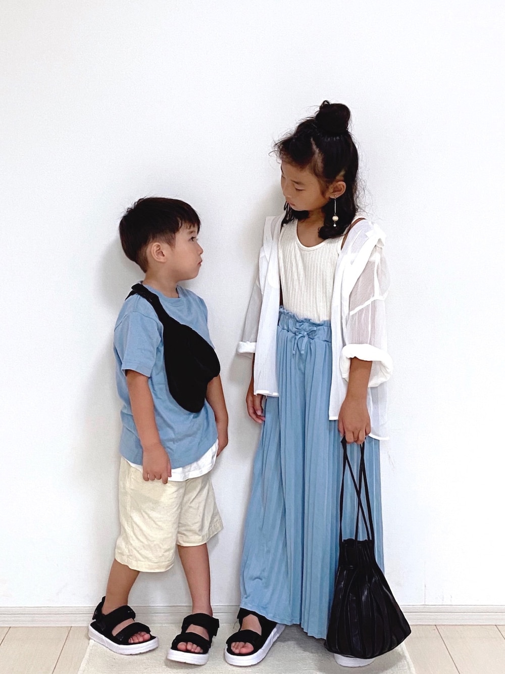 くすみブルー×ホワイト♡ シアーシャツ▷▷▷gu size140。 とりあえずタンクトップコーデはおしまいε-(´∀`; ) 覗いて頂きありがとうございました☺︎