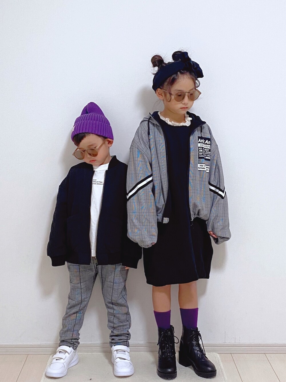 ちょっとjsファッションを意識してみたコーデ♪ 👧🏻アウター▷▷▷バースデイsize140。 👦🏻アウター▷▷▷Right-onsize120。 グレンチェック×ブラック+ちょこっとパーポー💟 覗いて頂きありがとうございました☺︎