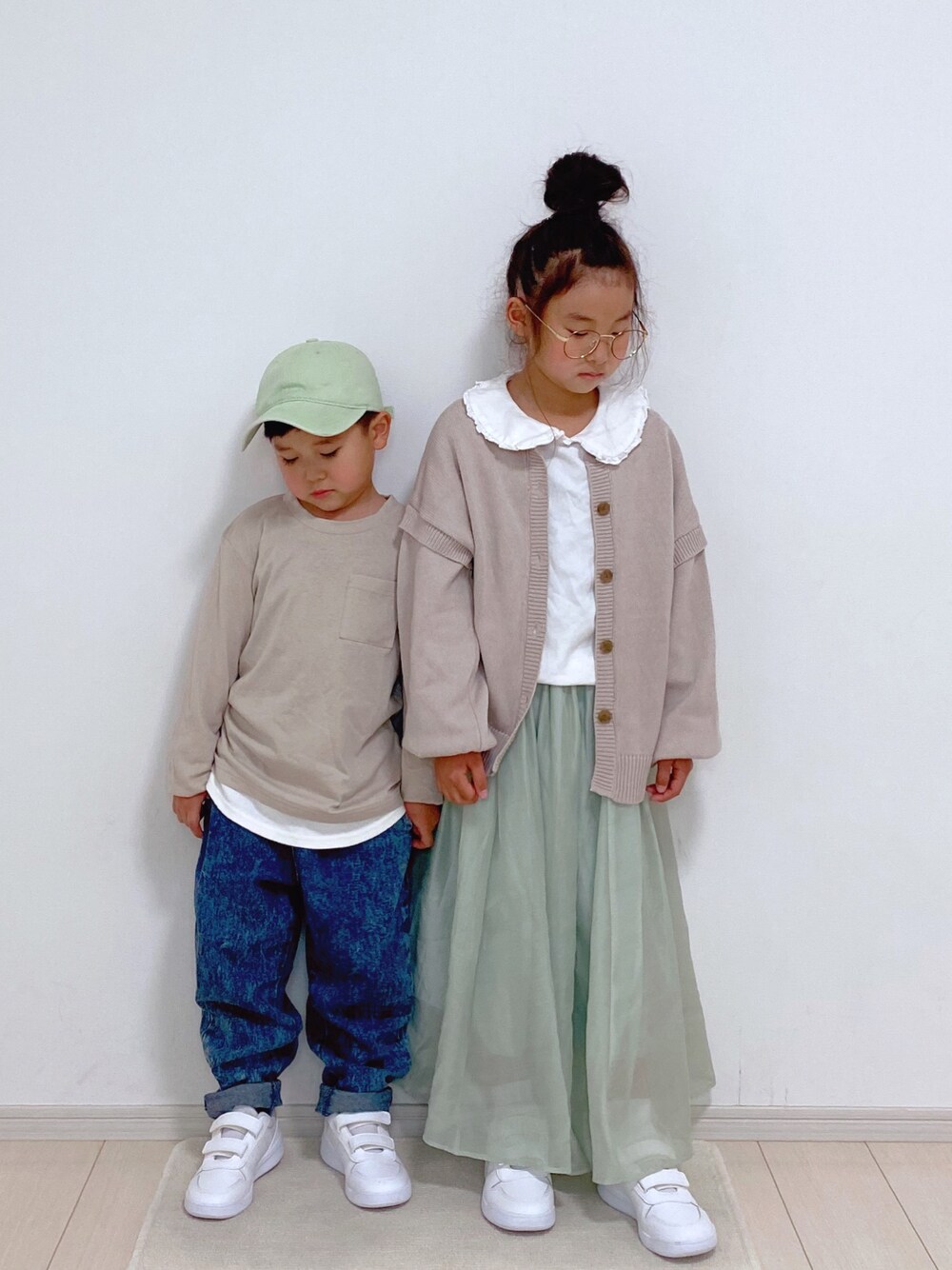 #パステル映える春🌸 最近カジュアル多めなので、久々に女子っぽコーデ♡ 実は我が家も持ってたguのフリル襟。 愛さんがかなり気に入ってて学校にもよく着て行きます♪ 👧🏻【7y10m/127cm】 フリル襟...size140。 スカート...size150。 👦🏻【5y11m/108cm】 ロンT...size120。 パンツ...size120。 覗いて頂きありがとうございました☺︎