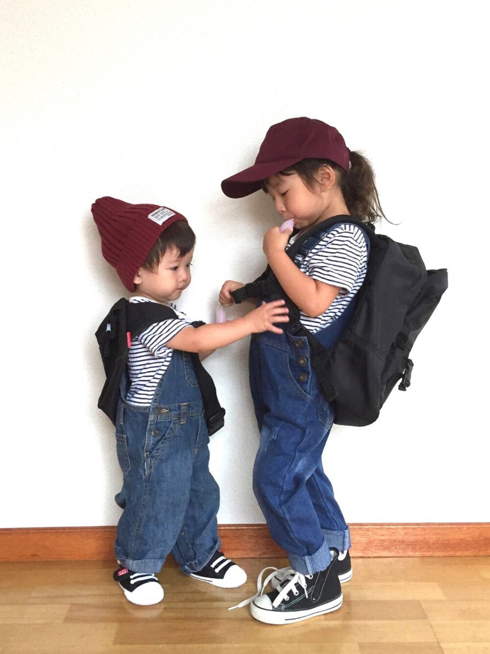 今日もHCKフェス参加させて下さい👟✨ ♡久々2人でサロペコーデ♡ ボルドーキャップは前にフォーエバー21で見つけた物⛑ 赤とボルドーが大好きすぎる私...😍 可愛い❤️ 小窓にはケンママお誕生日の時にこのコーデでも姫まりちゃんママが加工してくれてたので後夜祭として...🎊♡ 今日はパパお休みで、久々に出掛けるかも。 なので、ポチ逃げ多くなります😭🙏🏻 覗いて頂きありがとうございます😊 いいね&save&フォロー嬉しいです✨