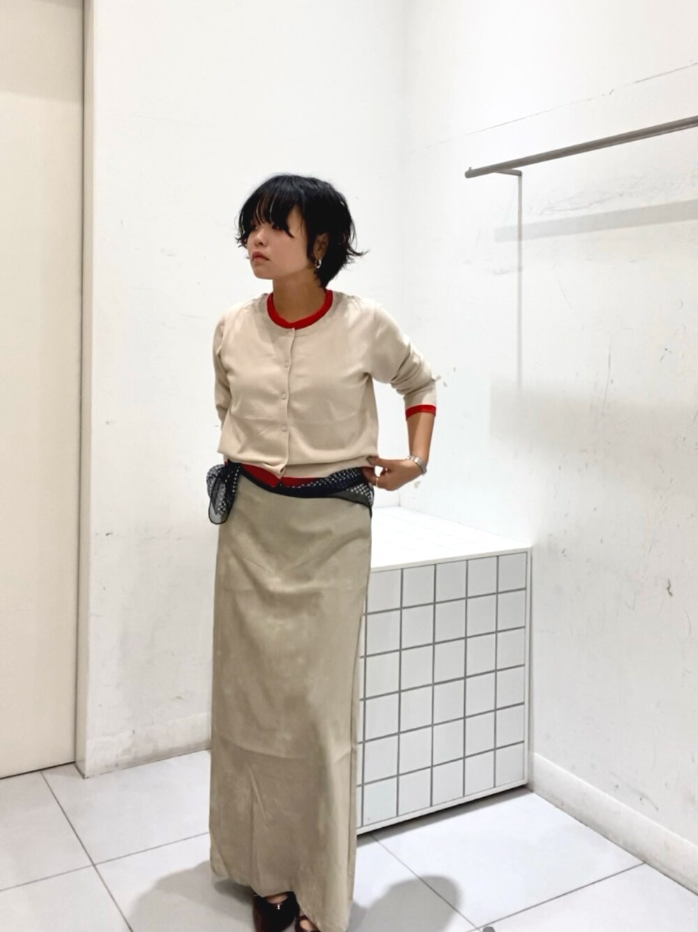 杏莉(SENSE OF PLACE グランツリー武蔵小杉)のニット/セーター「『一部WEB限定カラー』レイヤードバイカラーニットカーディガン」を使ったコーディネート