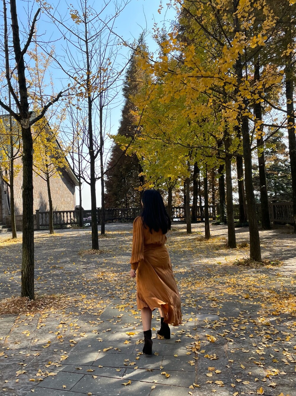 ゴールド系のワンピース/ドレスを着用したレディースの秋コーディネートの1枚目の写真