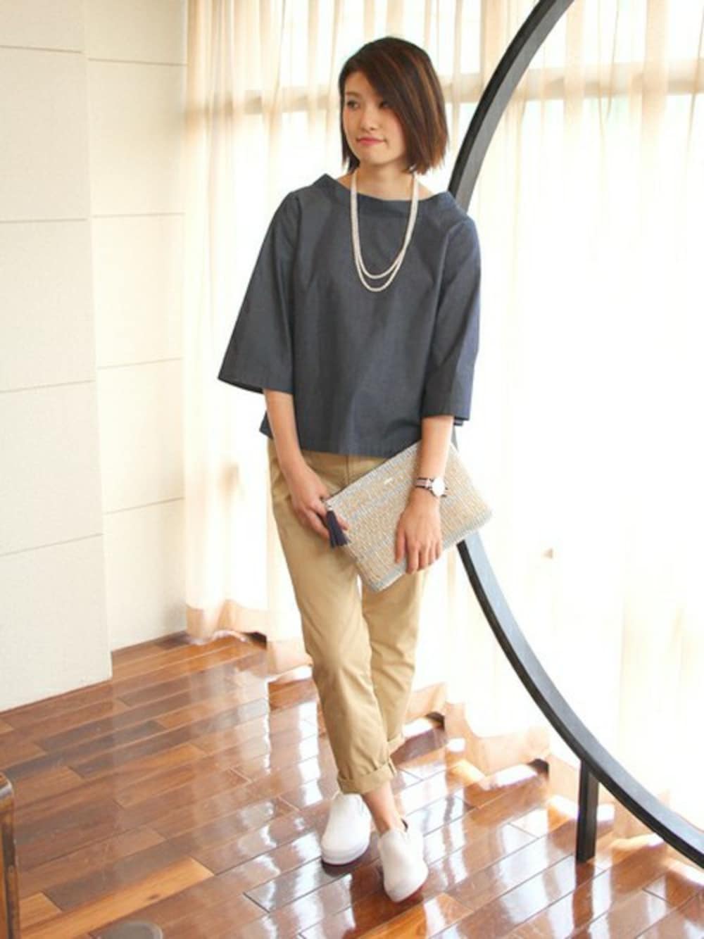 カジュアルながらにもちょっとキレイめな着こなしに使えるバックリボンのトップス。 首元の開きがキレイでネックレスとの相性抜群。ボトムはトレンドのチノパンツをロールアップさせパンツとシューズの隙間で程よいぬけ感を狙います。