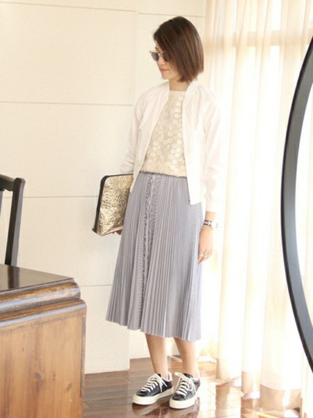 着丈の短いアウターと長いスカートと合わせて、全体のバランスを程よく調整しました。 暖かくなってきたので素足にスニーカーで気持ちよくお出かけしたいです。