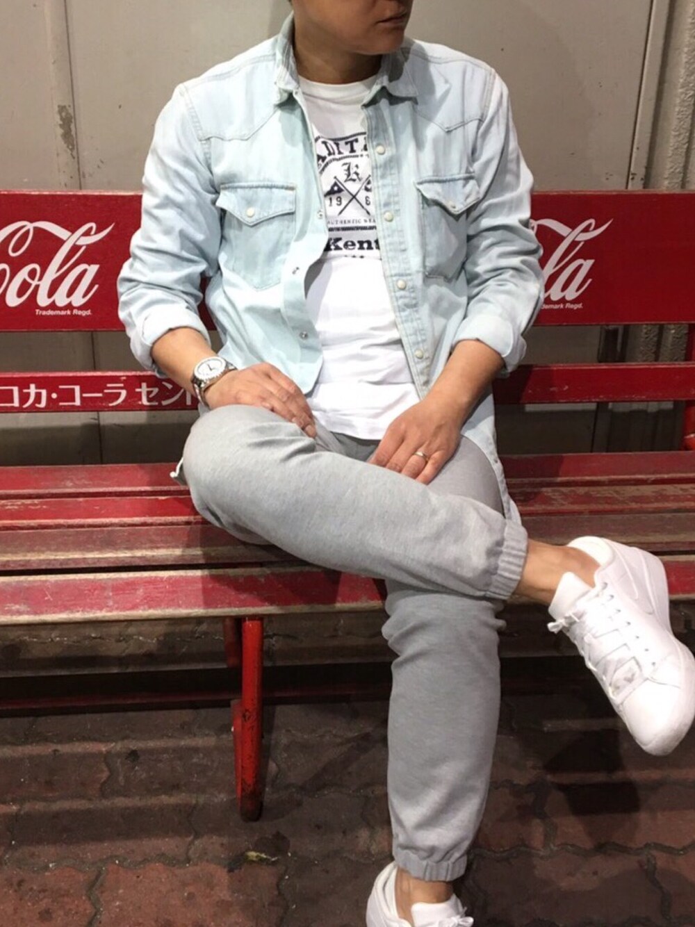 今日のオジさん👴🏽 肌さぶくて、デニシャツ着用💦 買い物して疲れたから ベンチで、ひと休み😩