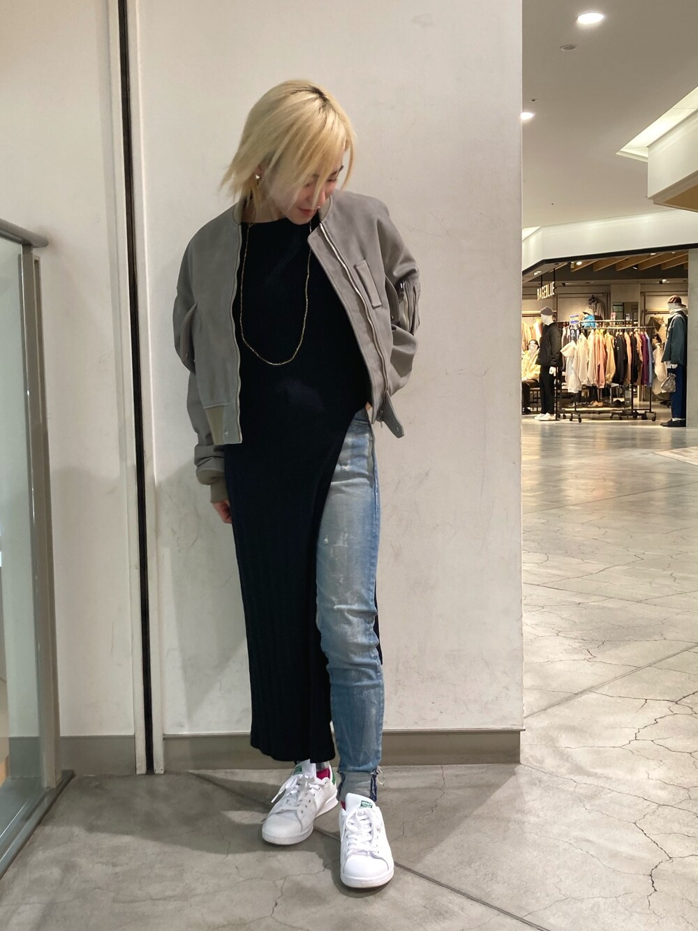 Schottのスリット入りワンピースとスキニーデニムを合わせた綺麗めなカジュアルコーディネート