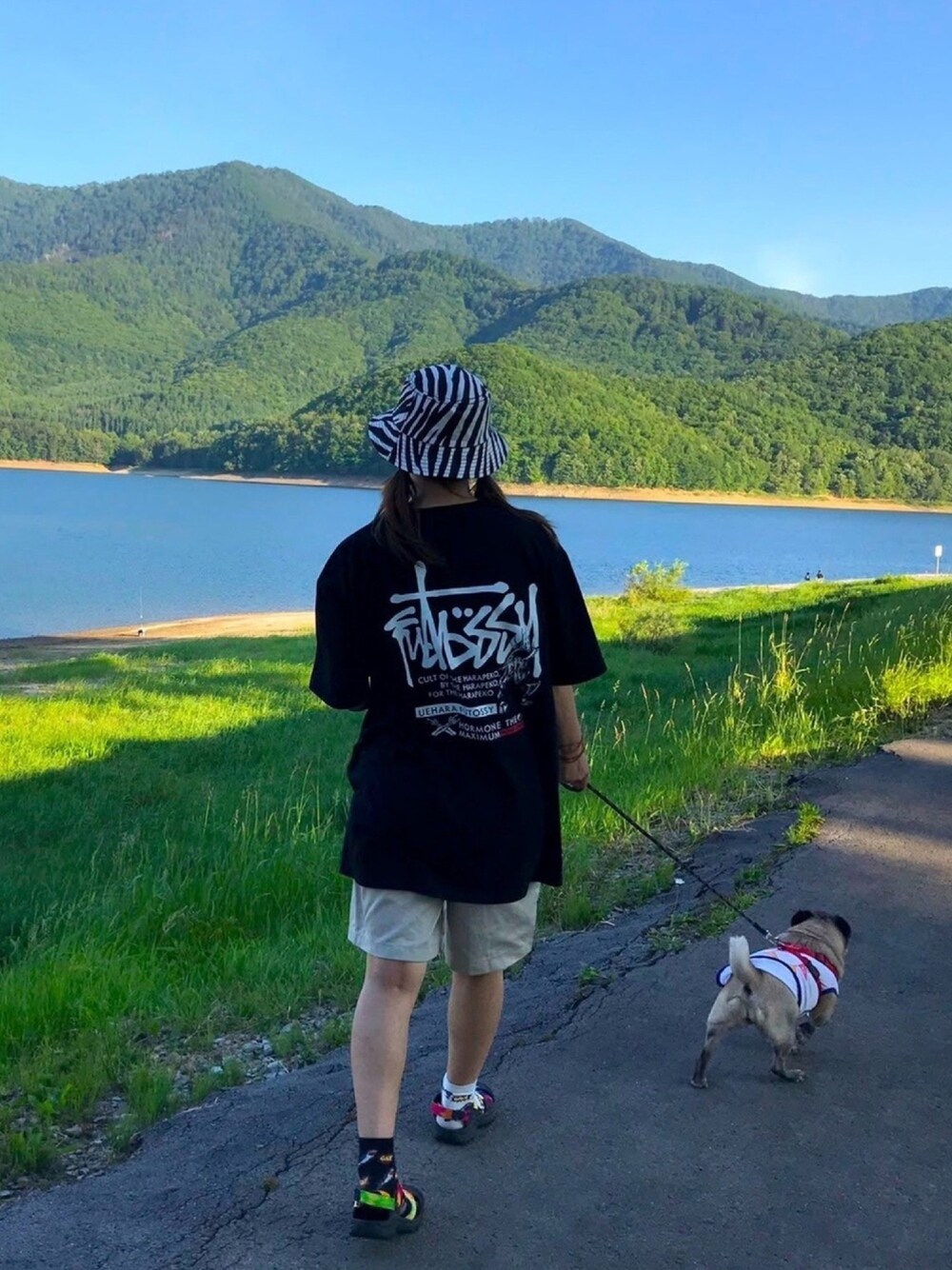 バケットハットは年中被れて好き🙆♂️ 写真は去年の夏ですが、早くキャンプに行きたいな⛺️ うちの🐶さんにもコールマンの服を着てもらいました