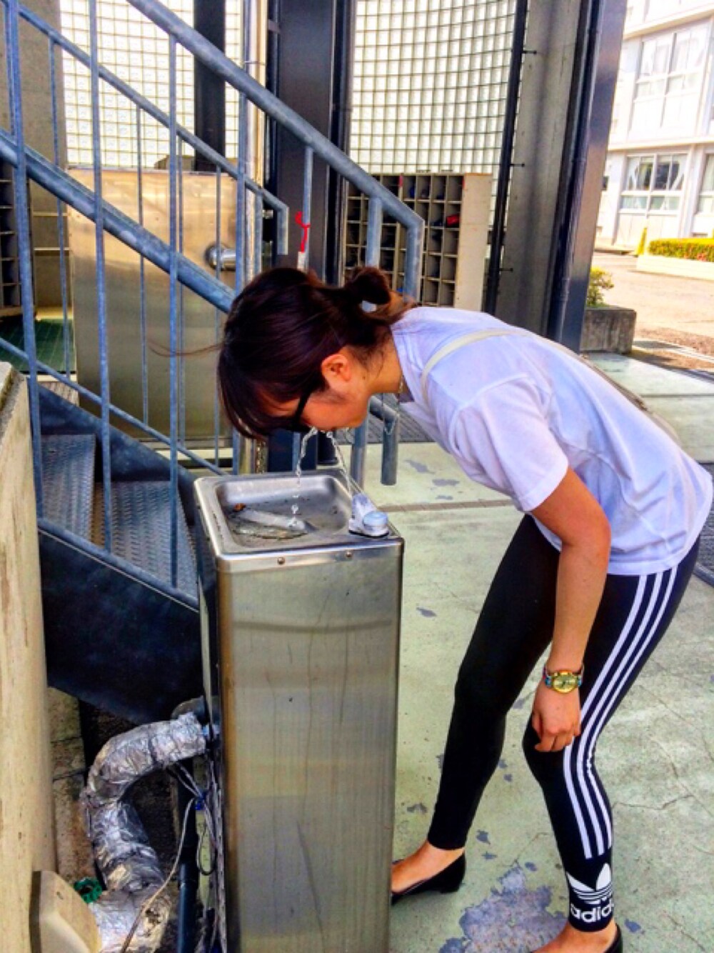 高校に行ってきました。 高校時代ここで飲めなかったので 念願の水飲みできました。 日差しすごすぎてサングラスが手放せない🕶☀️ adidasのレギンスはヘビロテです