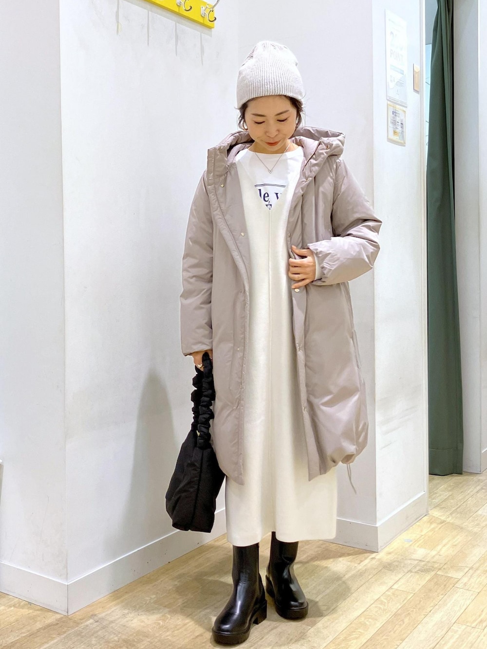 着心地の良いニットジャンパースカートに とても軽いロングダウンを羽織った楽ちんコーデです。 初詣や帰省、ご旅行等、いろいろなおでかけの際におすすめのコーディネートです。カラーをベージュやホワイトでまとめることで、見た目も暖かそうな印象になります◎