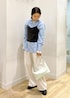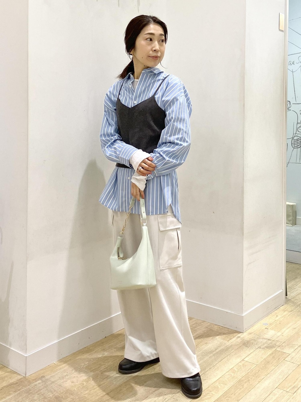 季節の変わり目にオススメの レイヤードコーデです! 春らしいストライプシャツに ニットビスチェをレイヤードすることで 暖か効果ありです◎
