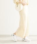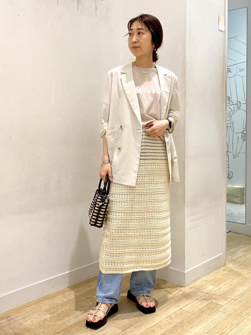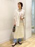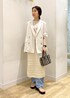 透かし編みスカートのレイヤードコーデです♩ ジャケットで合わせる事で カジュアルになりすぎないようにコーディネートしました。 存在感のあるスカートなので アイテムのカラーをホワイトやベージュでまとめて 統一感を出しました。