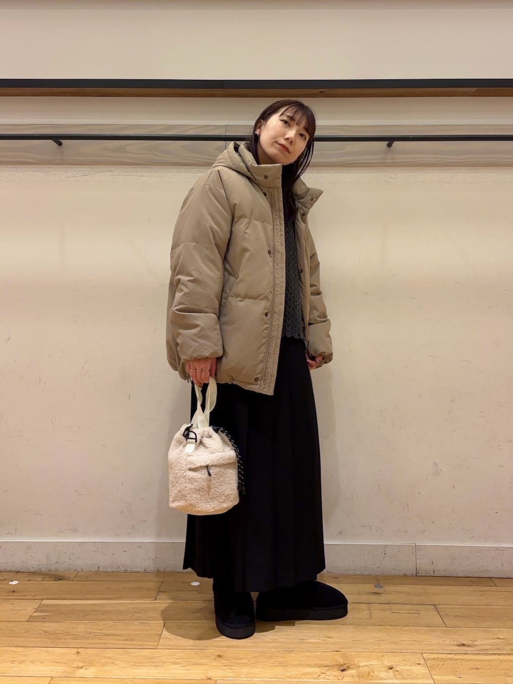 ご覧いただきありがとうございます 冬おすすめアウターのミドル丈のダウン カラーがベージュで今の時期活躍しそうなアイテムです フードはファフナーで簡単に取り外し可能です 是非店頭にてお試しください♪