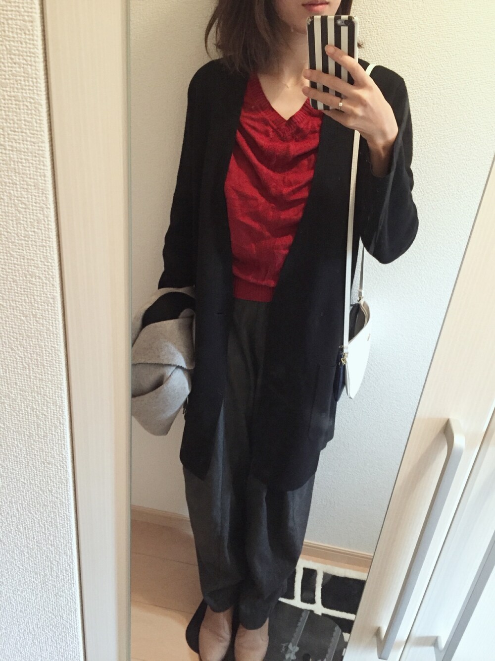 赤ニットでアクセントの今日のコーデ。 ワイドパンツとロングカーディガンで縦長コーデです♡