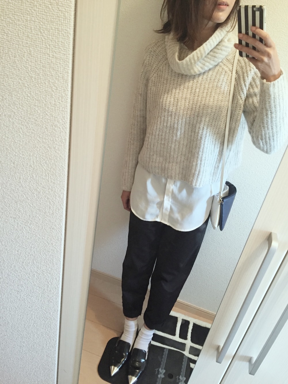 ニットにシャツを合わせた爽やか?コーデ。 短めニットなのでレイヤードするにはもってこいのこです\(^o^)/