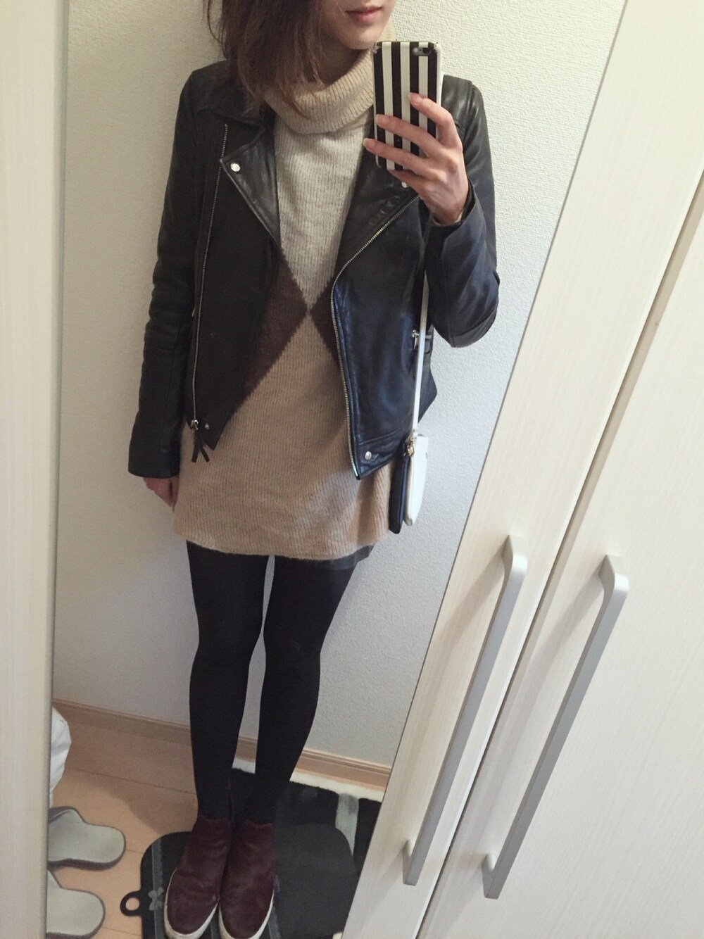 寒い中短めワンピ着てしまいました^^; 足がしがしです(´-`).。 ライダースはワンピとも合うしヘビロテです♡