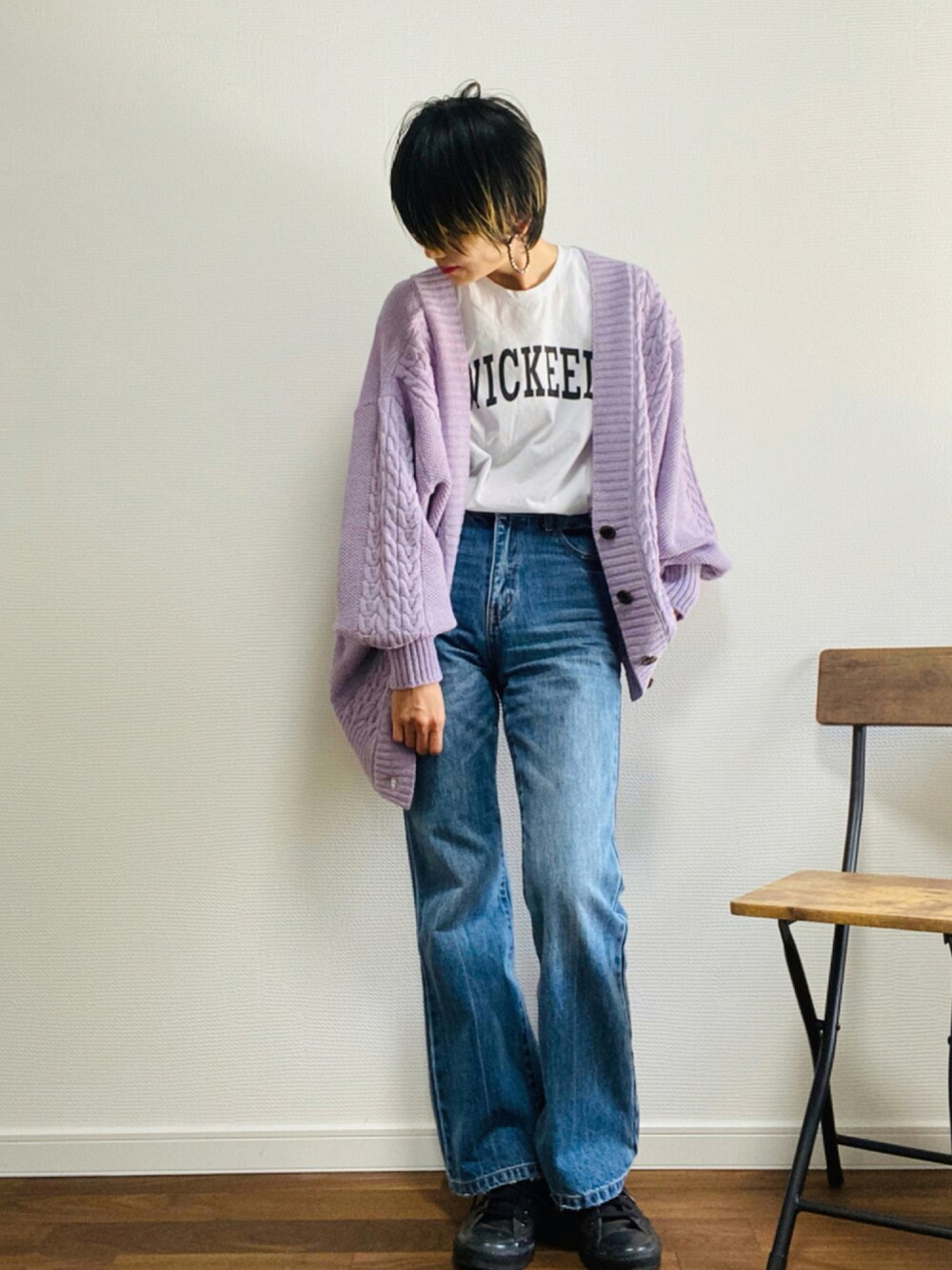 皆様、本日もご自愛下さいませ。 ニット連投中😋 くすみラベンダーパープルのカーディガン。 ゆるニットがあれば、秋も最強。