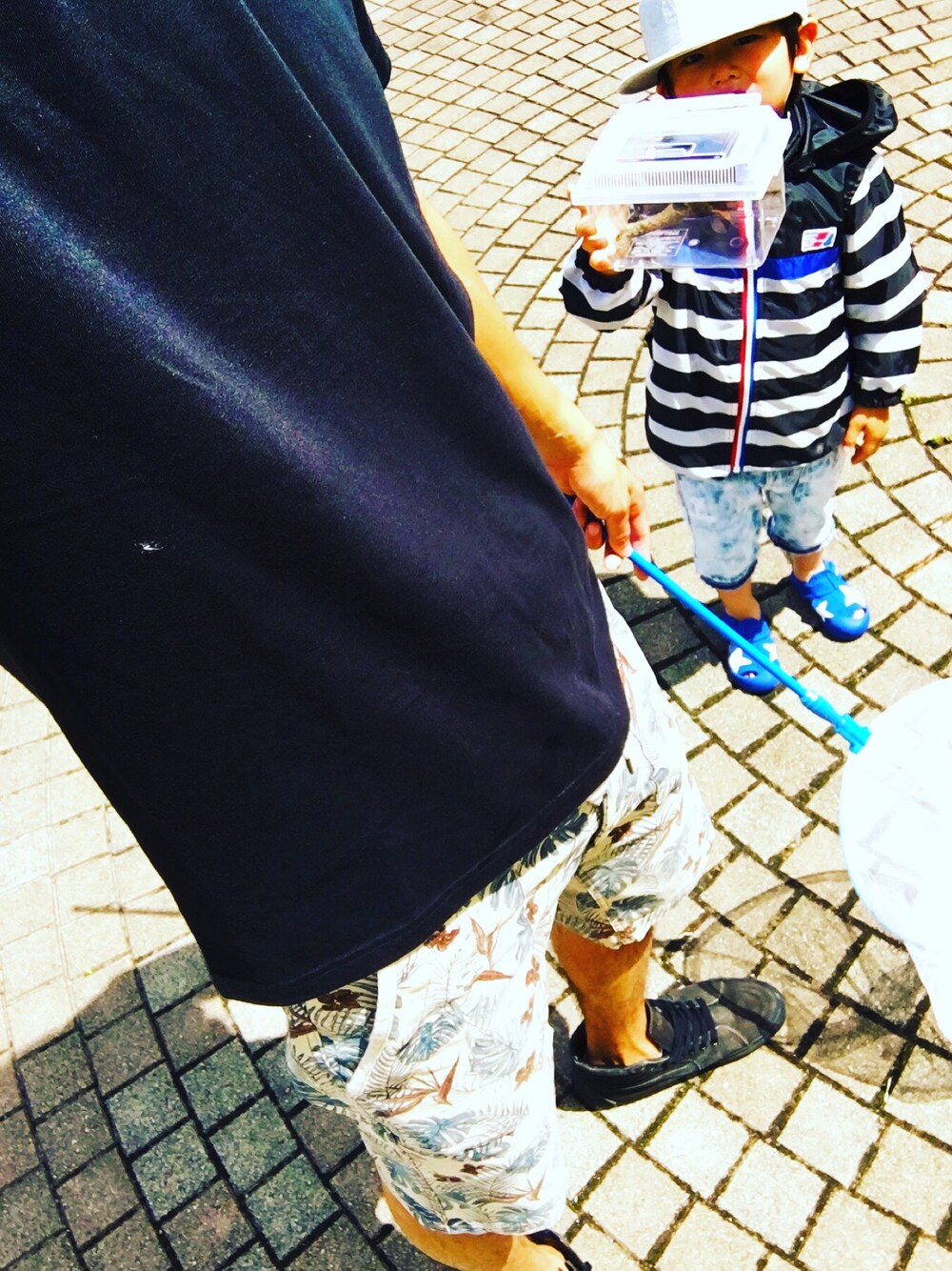 子供と虫取り 夏コーデ JOSEPH ABBOUNDの花柄ハーフパンツに黒VANS