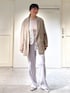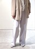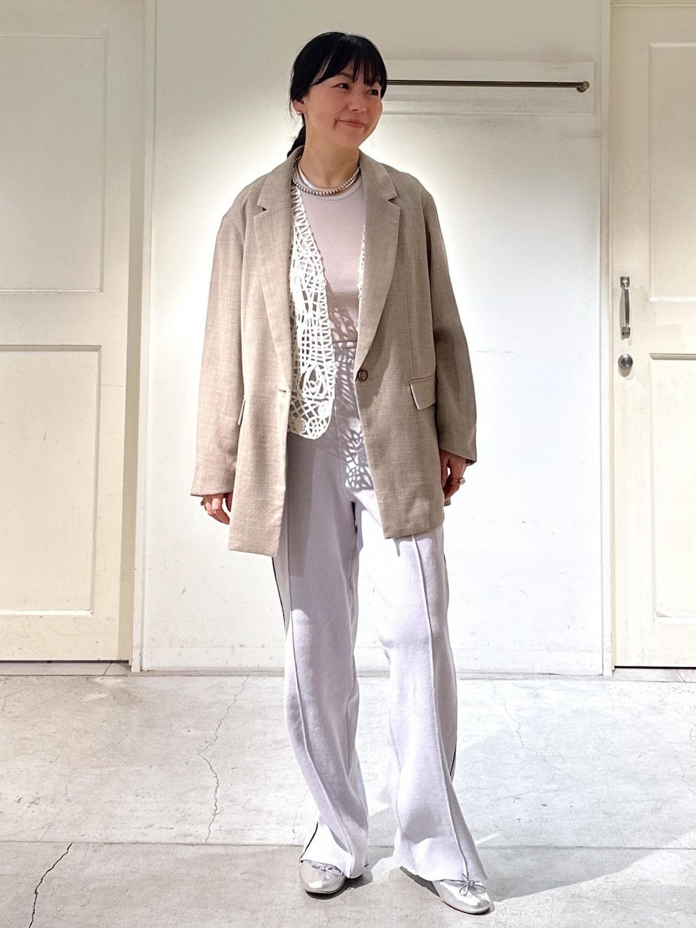 ベージュ〜ホワイトのグラデーションのスタイリング。固いイメージのジャケットもリネンのような柔らかさと抜け感があるこちらと、レースジレとのレイヤードでプリミティブなムードにしてみました。 アクセサリー/ 私物