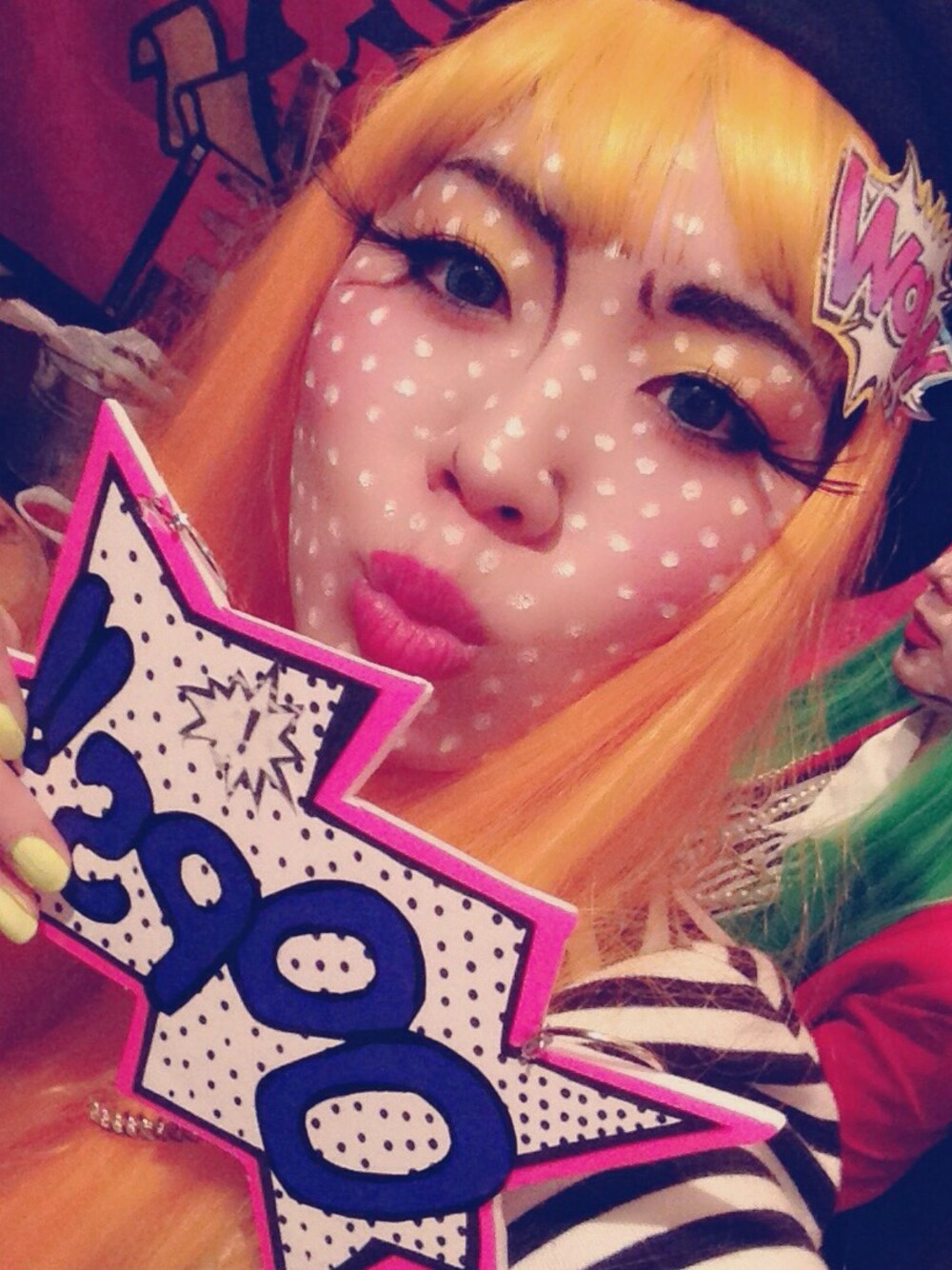 アメコミメイク(^.^) 近くで見ると気持ち悪いですw ドットはポスカ 眉毛、輪郭、鼻筋はフェイスクレヨン 吹き出しとピンはhandmade♥︎