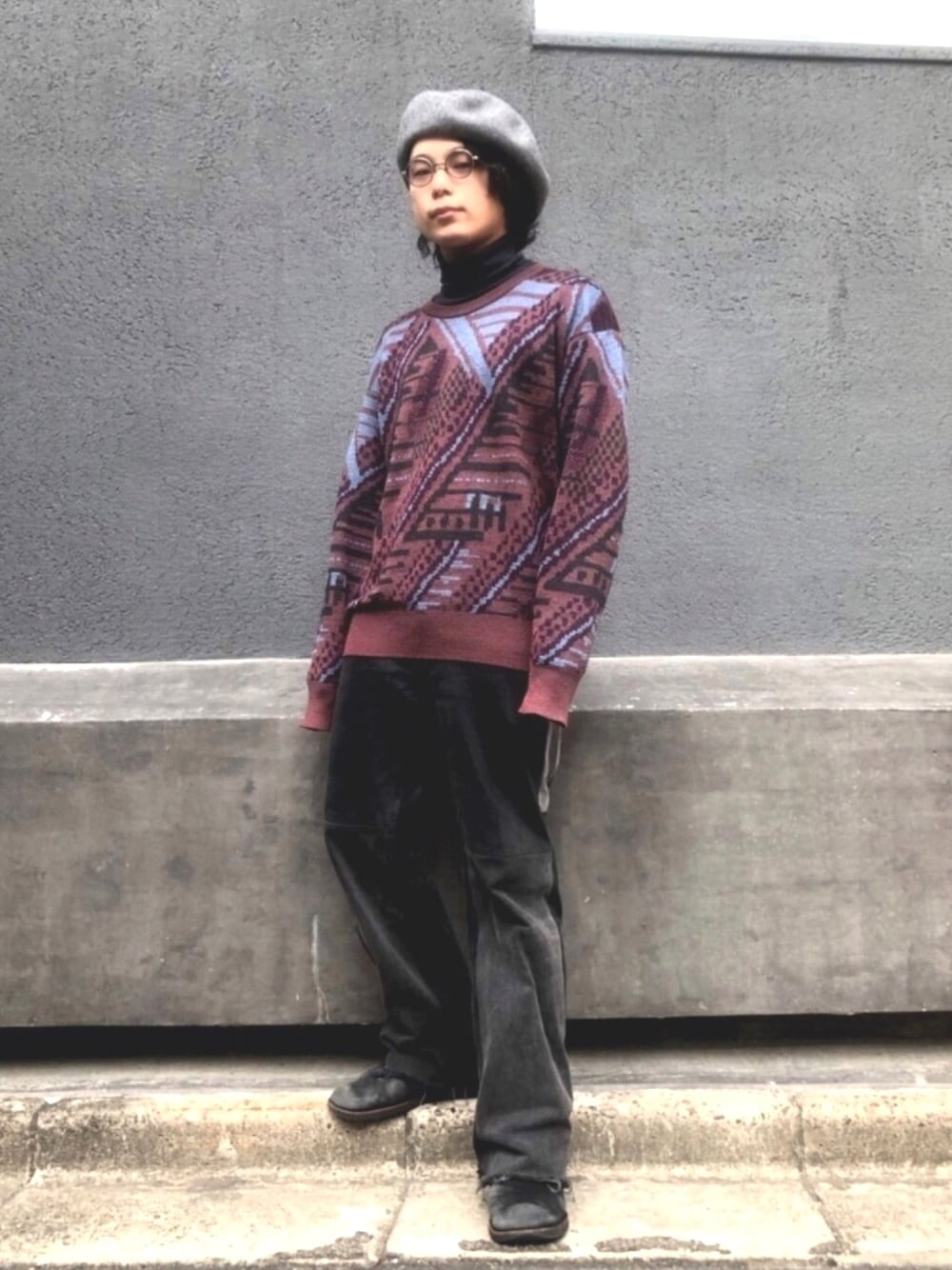 初投稿。 【ボリュームたっぷりのベレー帽】 ニットもパンツもゆったりめのシルエットで、全体のボリュームバランスを整えてます。 眼鏡は、顔面フルオープンなので、しっかりリムのあるkearnyのsteveでシメました。