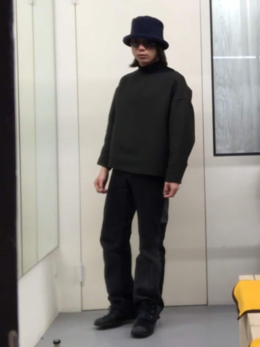 パイル地のバケットハット。 オリバーのネイビーレンズで色揃え(メガネ見えんけど) 小ぶりのハットに対してゆったりフレアパンツで今ハマってるAライン。