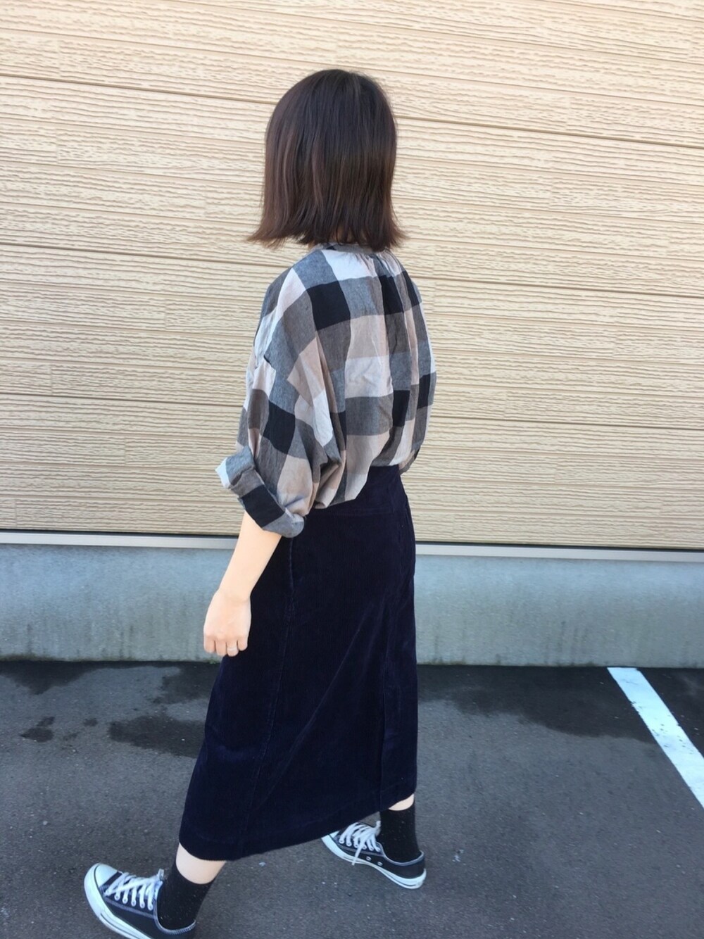 コーデュロイスカートにチェックシャツイン