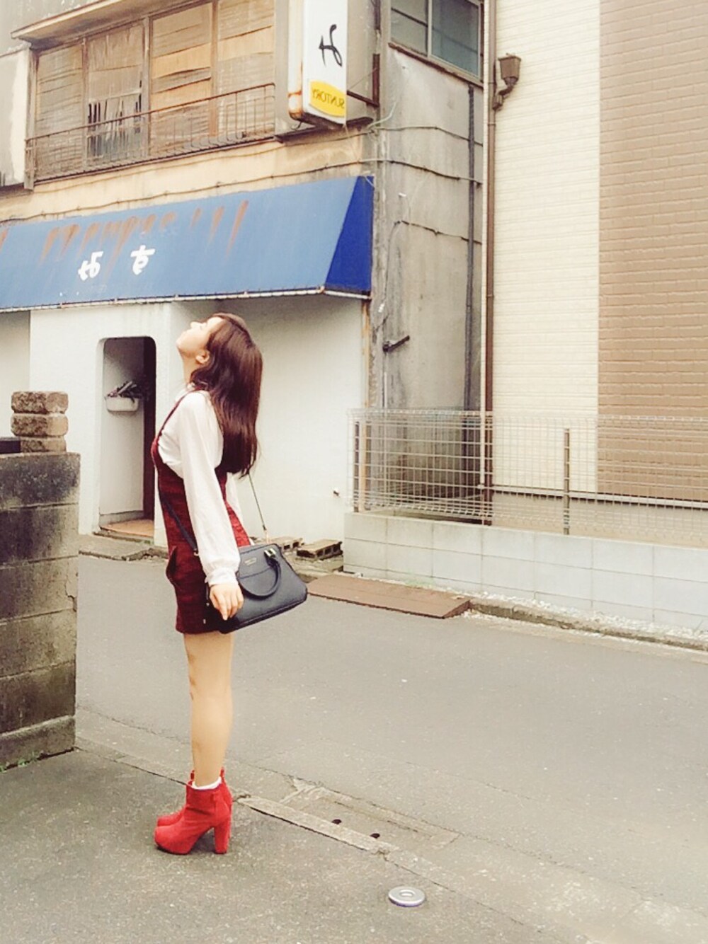 赤のニットワンピースとショートブーツで秋らしく〜( ´ ▽ ` )ノ☆
