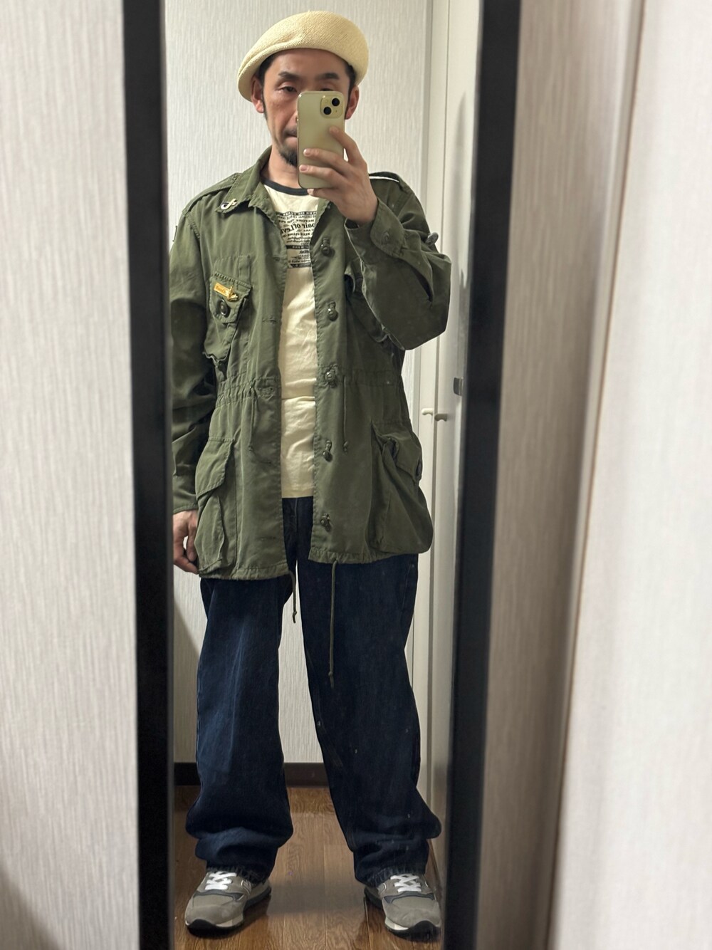 春のミリタリーはファティーグジャケットがよさげ。丸いハンチング帽をベレー帽風にかぶって同系色のリンガーTにバギーシルエットの578。スニーカーよりブーツのほうがまとまるけど998が履きたかったのでスニーカーに。。。これはこれでアリかもです