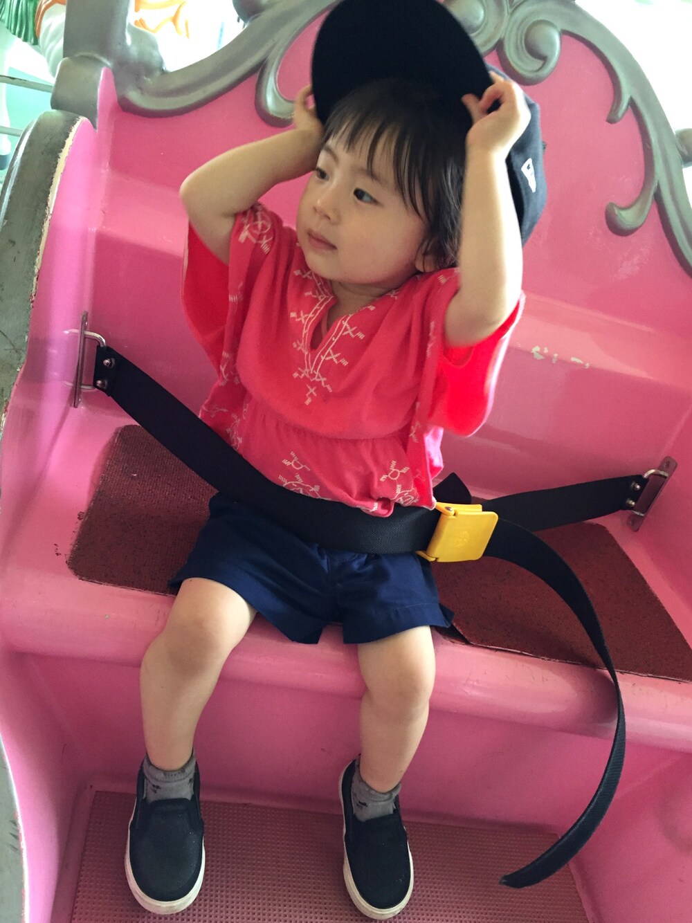 パパの帽子を被ってみたい(*^_^*) ボーイッシュだけど、ピンクで可愛らしいコーデにしました🎵