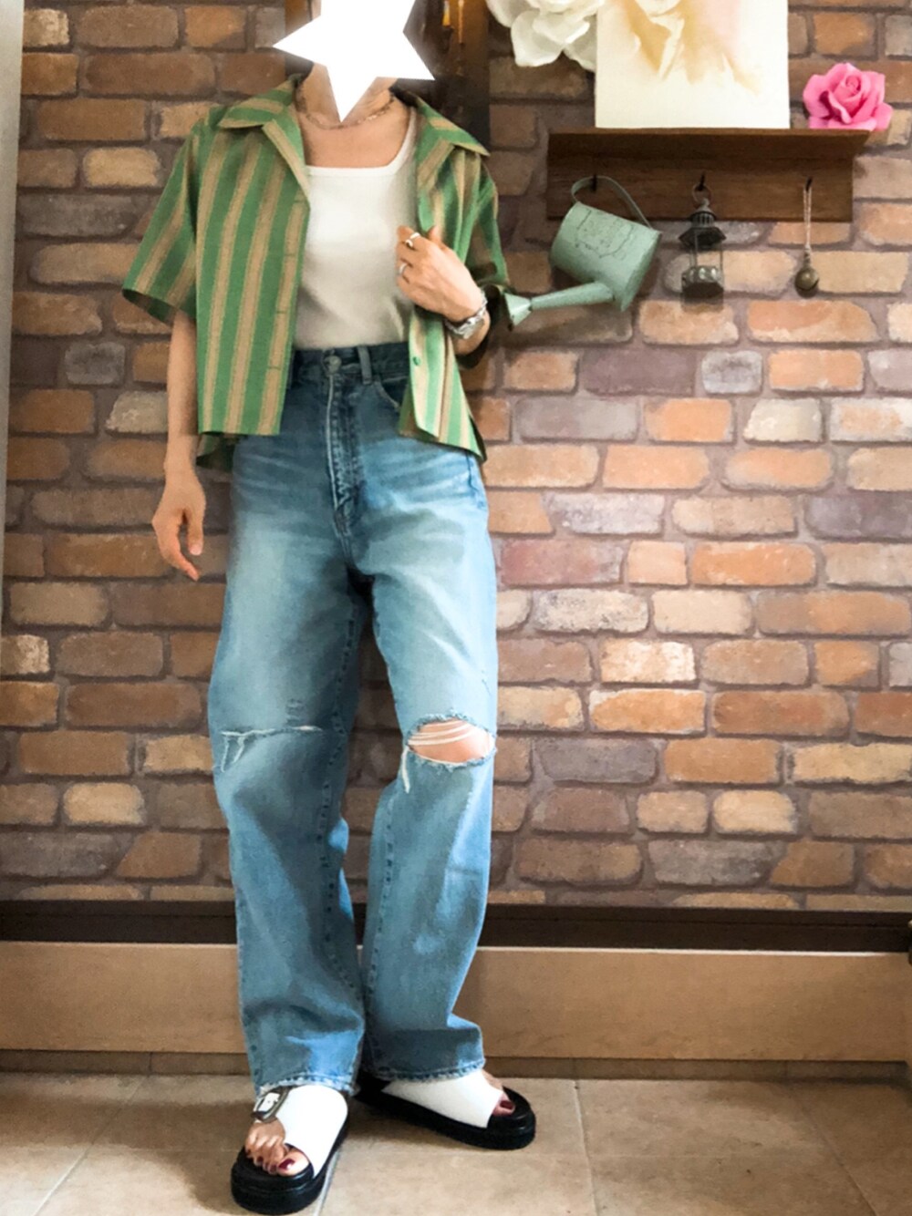 久々の晴れ嬉しー(*,,˃ ᵕ ˂ )✰*。 インナー以外moussy 大好きなデニムにストライプシャツ 合わせハリ感のあるシャツだから シワになる心配もなし♡♡ メチャクチャかわいー ウエスタンバックルが付いた 今季のトレンドのトングサンダル 好きなタイプです😍