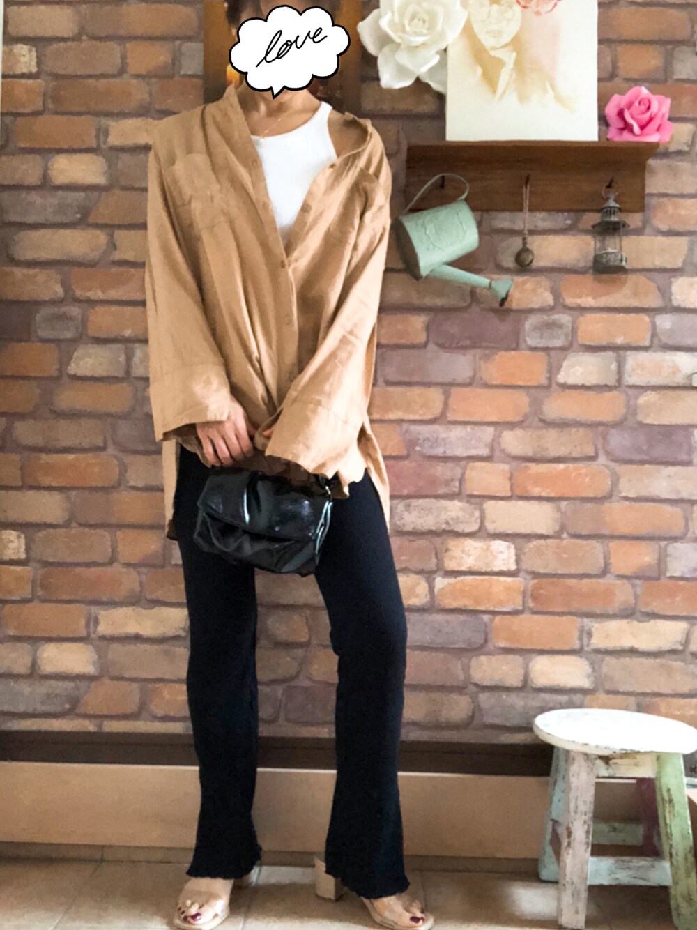 オーバーシャツで秋っぽく インナーはまだまだ暑いからアメスリ タンク( ˙꒳˙ ) uluのリブスリットレギパンで スッキリシルエット