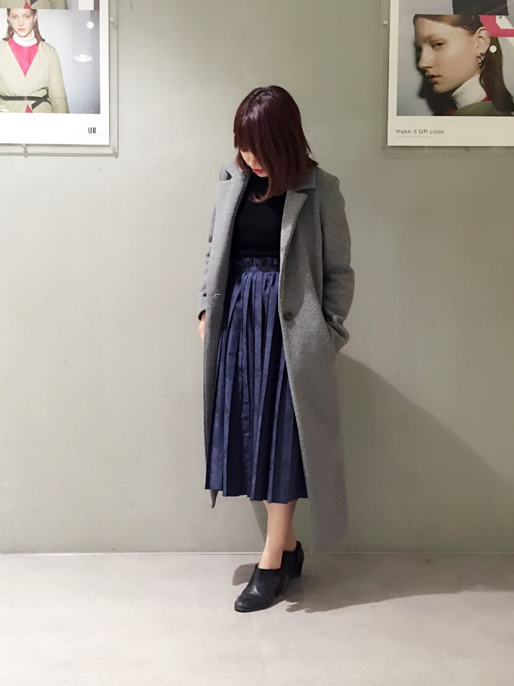 細身なロング丈のチェスターコート にハイウェストのプリーツスカートでロング丈コーデ 身長が低くても形が綺麗だったり、ハイウェストを取り入れればロング丈も着れちゃいますよ🙆🏻🌟