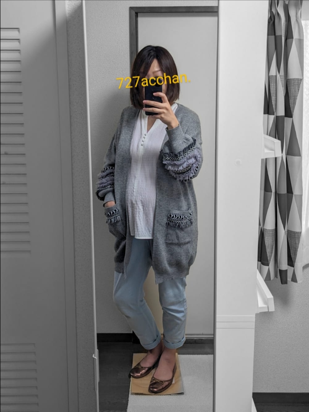 カーディガンと靴と鞄でバリエーション。 お腹が大きくなってくると着られるトップスもボトムスもかなり限られてくるので、もう羽織と小物で幅を出すしかない!