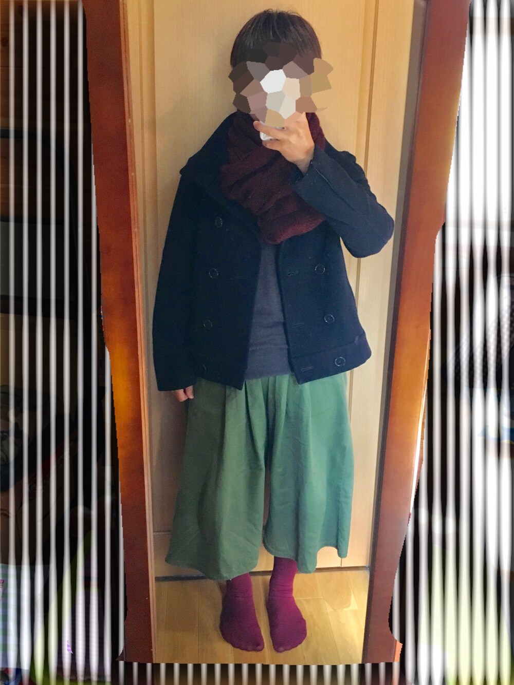紺のピーコートはワールドワイドラブ!で、これまた何年も前のものですが、ベーシックな形なので愛用してます。 スヌードはマフラーのように巻いて首ぬくぬく。 300円ショップで買ったタイツがめちゃあったかいし、伸びるし買って正解でした! 上下ボルドーで揃えてキメ!